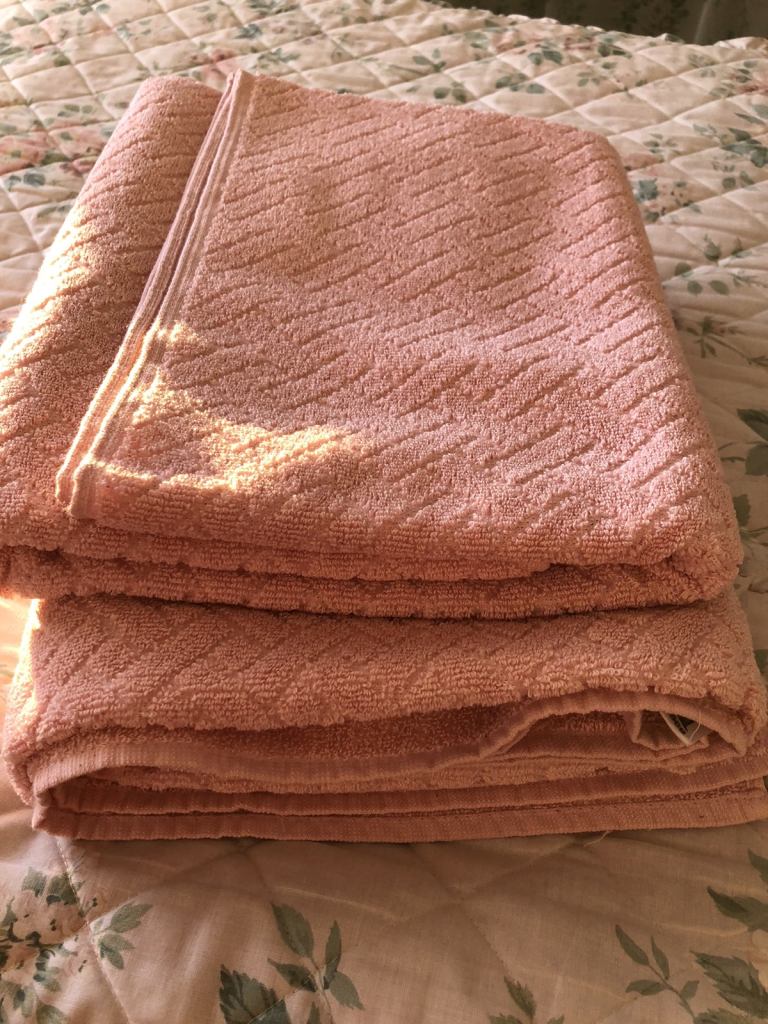 New towel set unused, colour is pink/peach. One Bath sheet and one Bath towel.