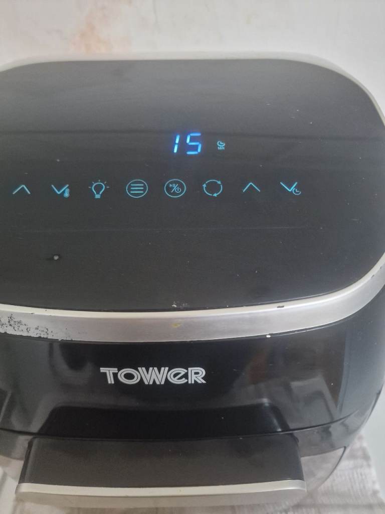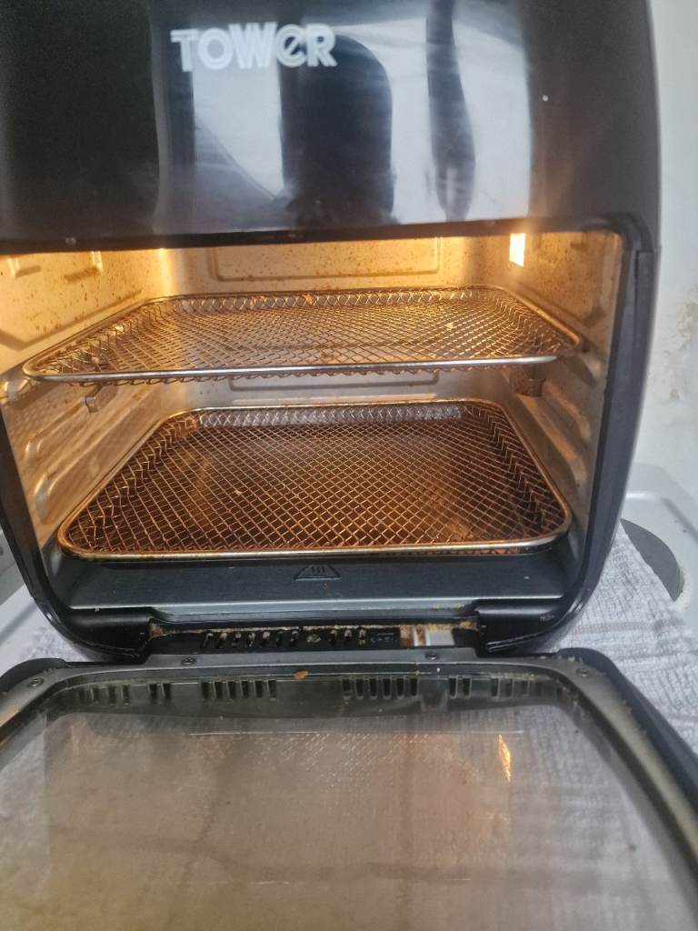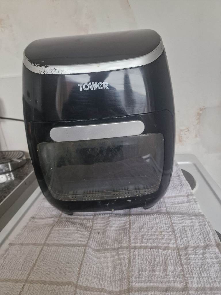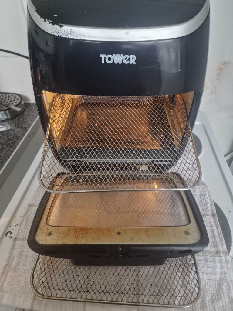 Black and gray stacked airfryer. Cooks anything. Two shelves one tray. Works great. Asking 30 but open to offers.