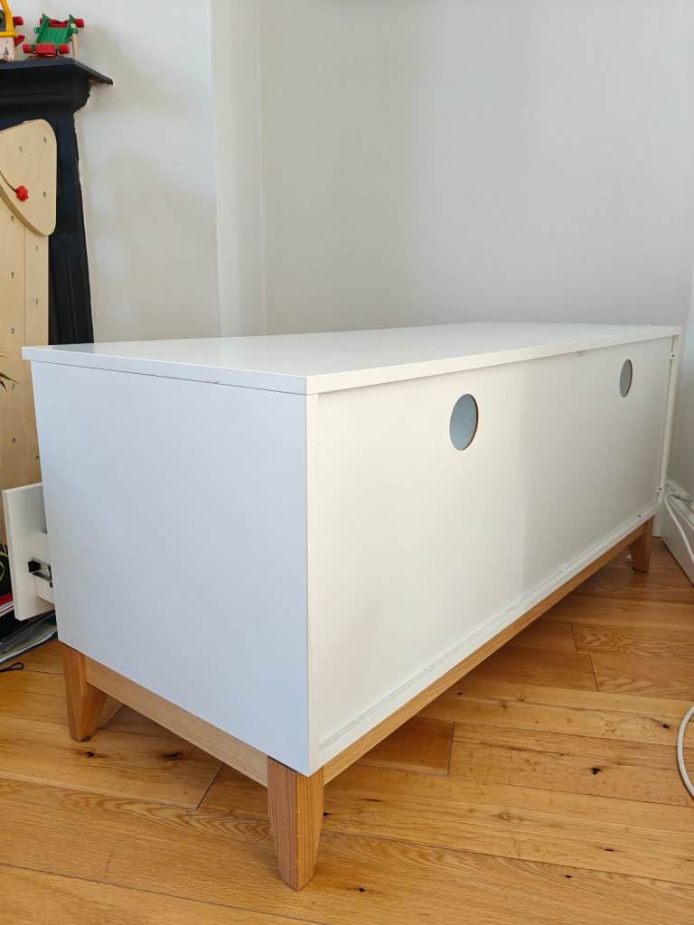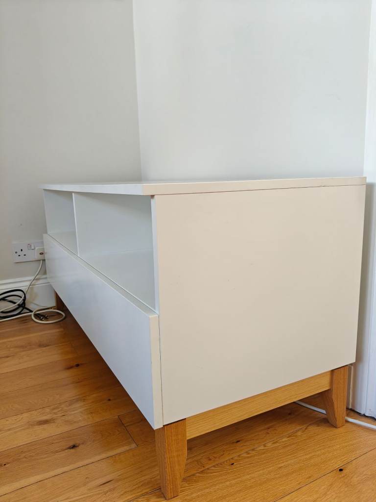 TV unit white and oak scandinavian style. Perfect condition, not been used as we hang our TV on the wall. 1 long drawer (120cm) and holes for cables on the back. Paid 300.