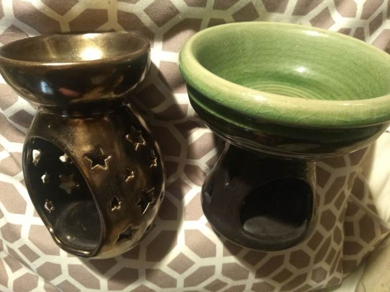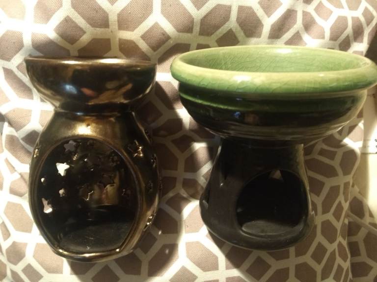 These are two great condition essential oil burners. Nice sizes. Theres a gorgeous bronze coloured one at 14cm high. Then theres a 13cm green and black one that has very large bowl(13cm wide) for putting oils in. Price for both. You dont have to use essential oils. I use fabulouso and fabric conditioners also. any liquid that gives off an aroma will intensify when heated.