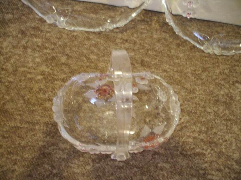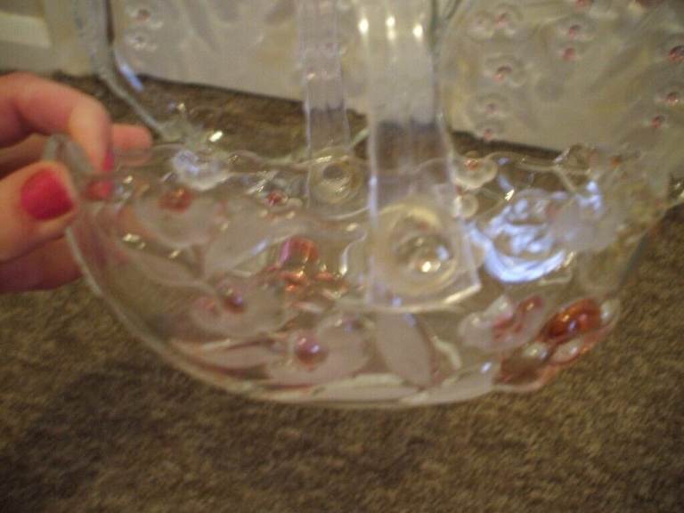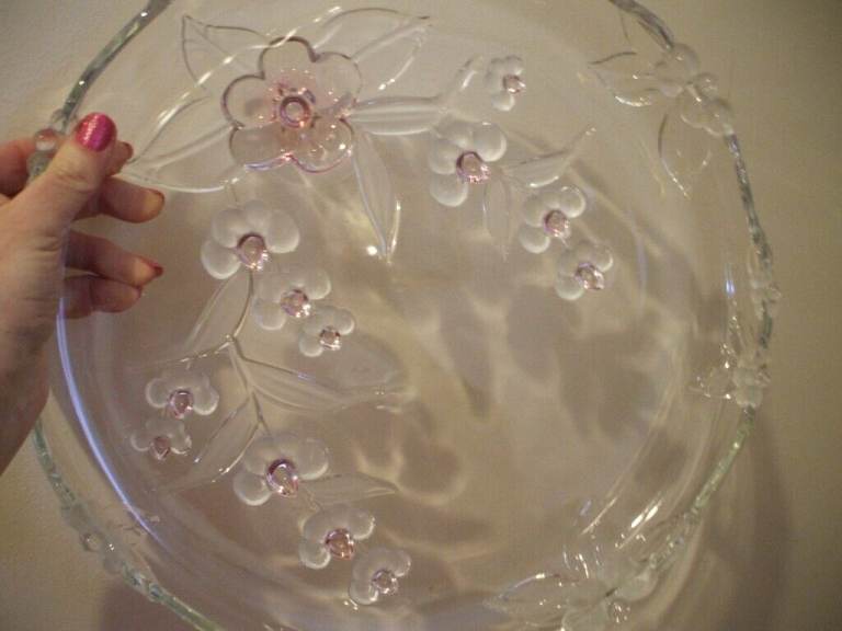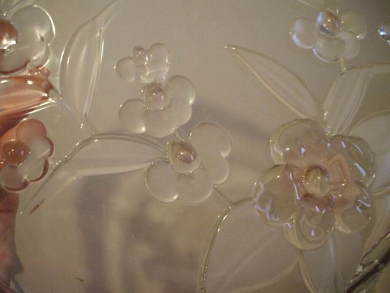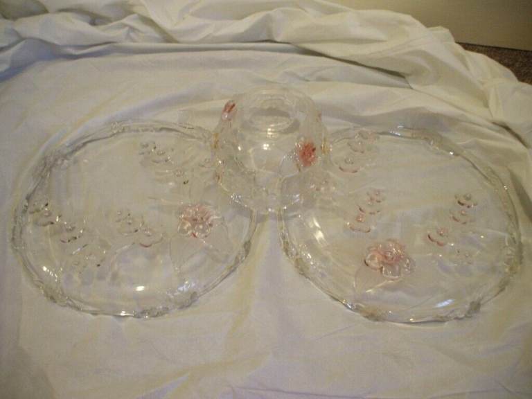 2 BEAUTIFUL PRESSED/MOULDED GLASS PLATES WITH RAISED MOULDING ON UNDERSIDE AND SIDES. 31 CMS DIAM EACH. DECORATIVE YET FUNCTIONAL FOR SPECIAL OCCASIONS. IDEAL PARTY WARE. PRETTY ROSE PINK ON PLAIN GLASS. SWEET DISH/POT POURRI DISH ?- WITH PLASTIC HANDLE 20 X 13 X 7 CMS. ALL GOOD CONDITION AS HAVE BEEN STORED AWAY. ONE PLATE HAS ACOUPLE OF SMALL 'SCRATCHES' HENCE REASONABLE PRICE.