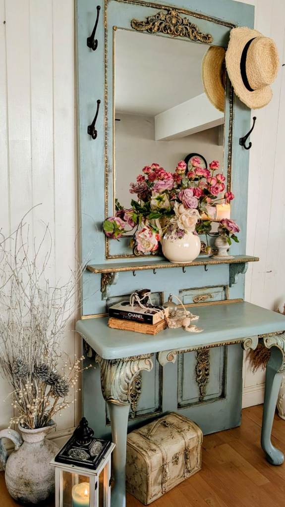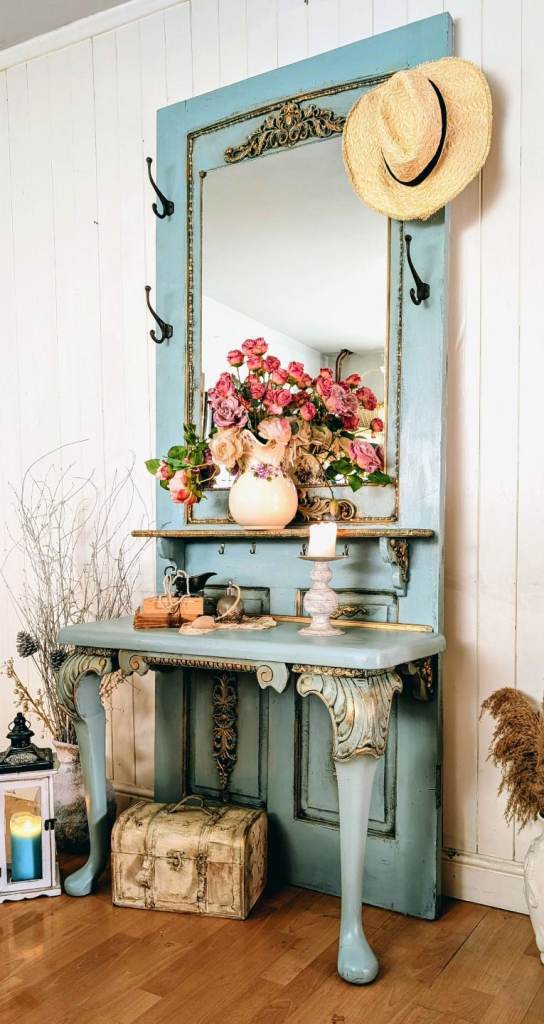 Vintage, French Style Old Door Entryway Hall Tree, Hand-made and Hand-painted.