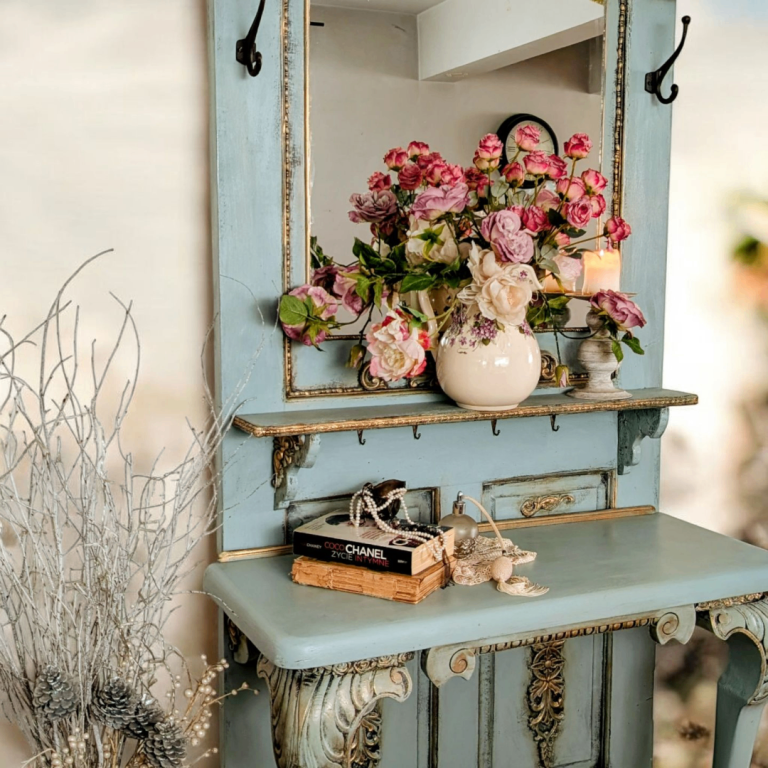 Bring timeless European charm into your entryway with this exquisite Vintage French Style Hall Tree, crafted from a reclaimed antique door and lovingly hand-painted to highlight its ornate architectural details. Inspired by 18th-century French countryside estates, this hall tree serves as a statement piece and a functional storage solution.