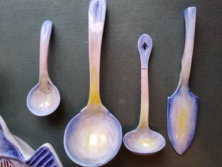 This very unusual pottery set consists of the platter, a large dish and two small dishes plus a serving slice, large ladel, small ladel and serving spoon. It looks spectacular on the dining table with a side of salmon and accompaniments but is equally eye-catching when a table or sideboard centrepiece. Originally from Crete. In as new condition.