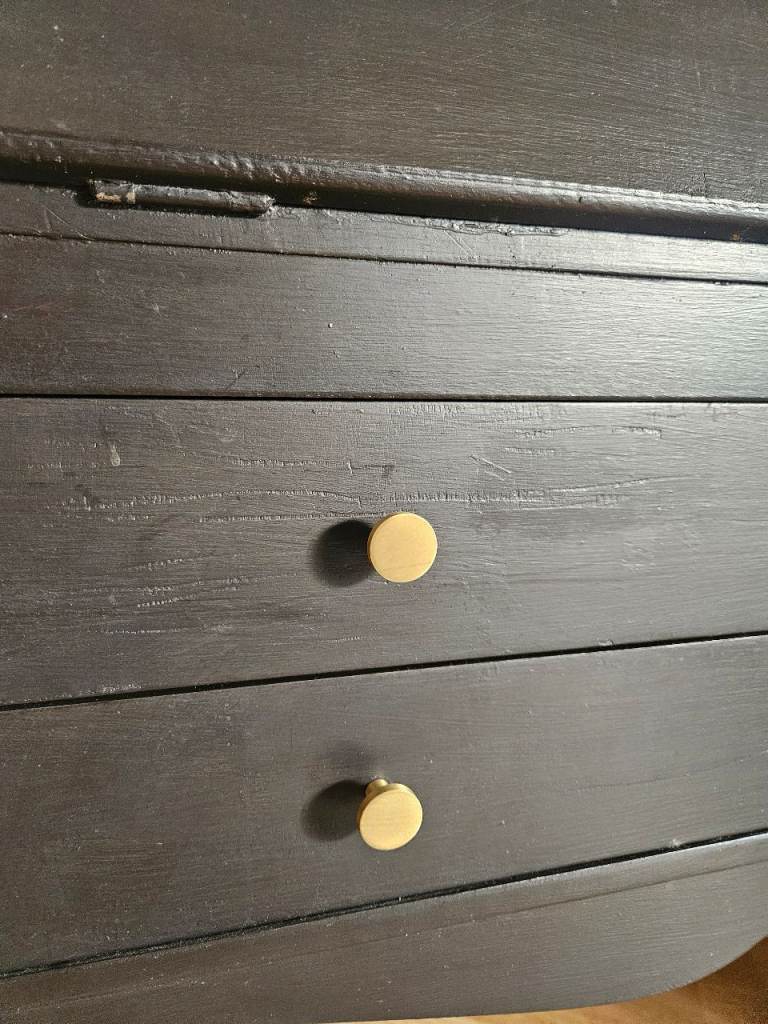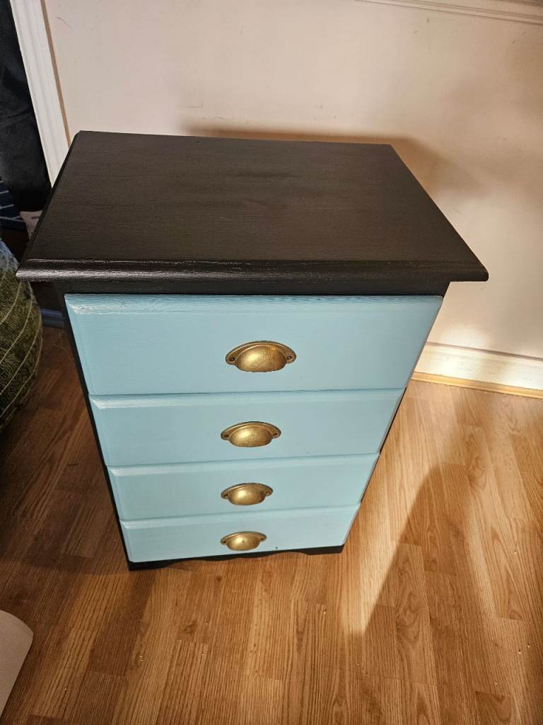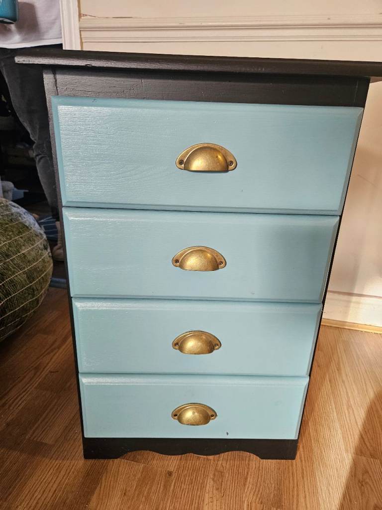 With matching side draws in black and blue with brass gold handles. Made of composite wood and formica but all painted.