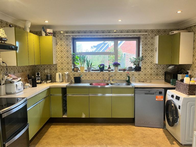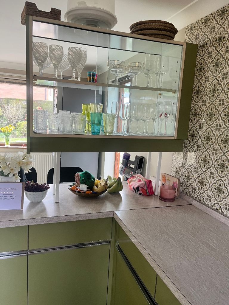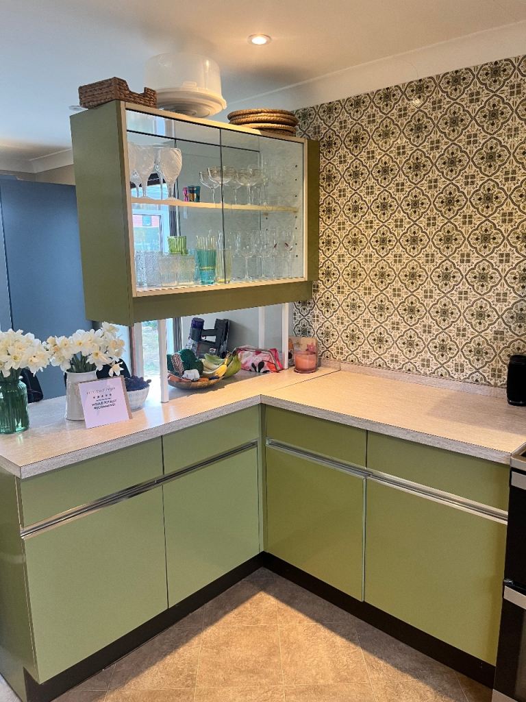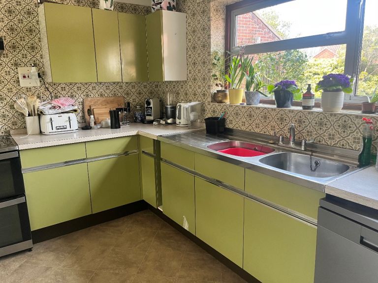 A fantastic retro kitchen set with multiple base units, wall cupboards and a glass display cabinet. These kitchens are highly sought after by collectors and those restoring mid-century homes.