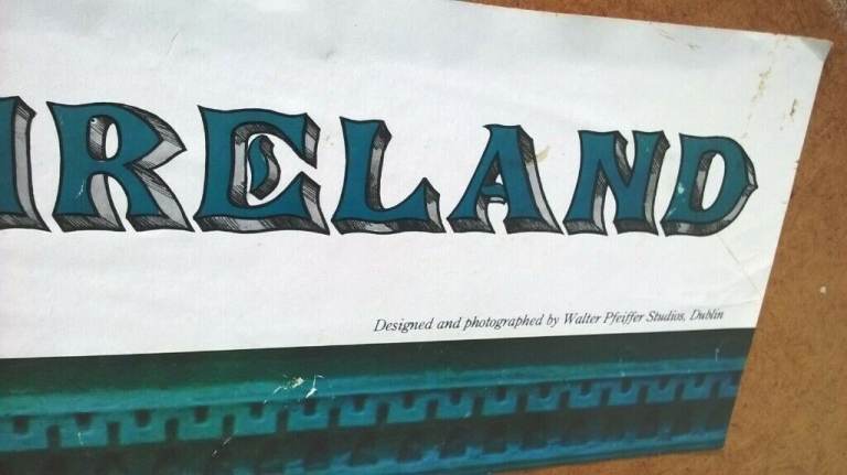 Its in good vintage cond' you can see that it has at sometime been rolled & there is slight discoloration on the side nothing to bad or that deters from the look, I think from the label on the back it has hung somewhere in Ireland shop/Pub? there are a few white speck's under the Glass I think this is just dust & would brush off if it was re-framed, The frame is a little dated