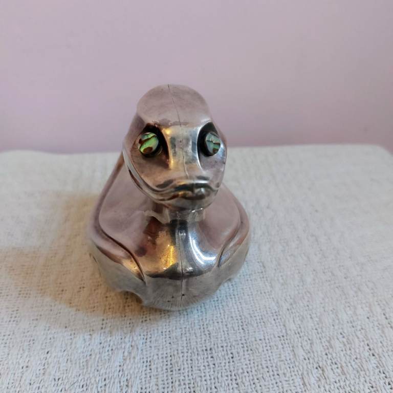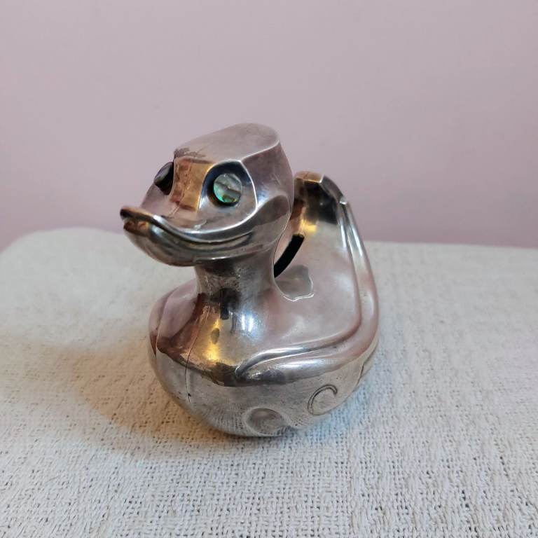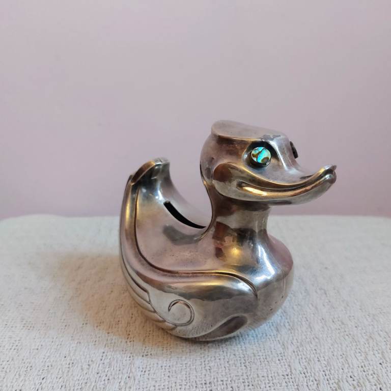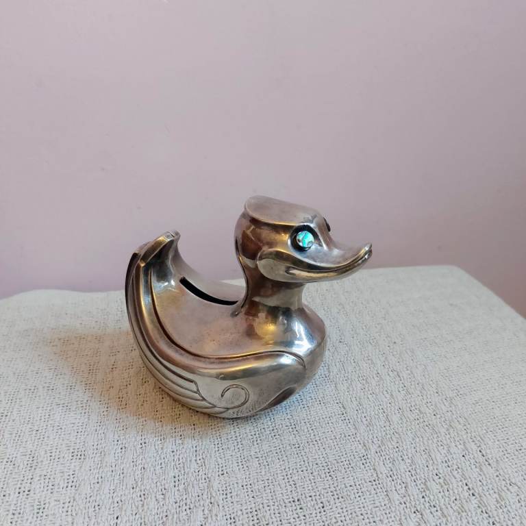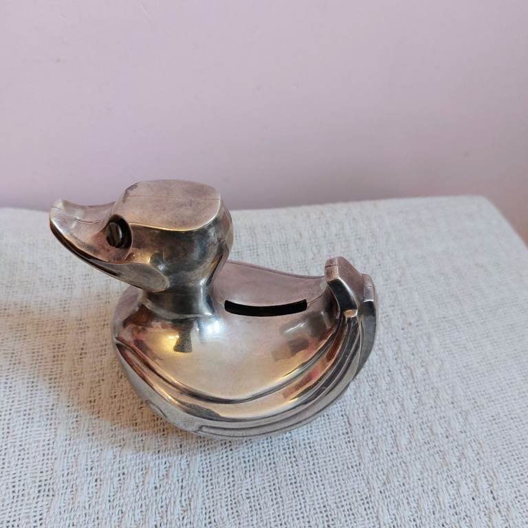 A lovely heavy vintage Falstaff silver plated Quack The Duck money box