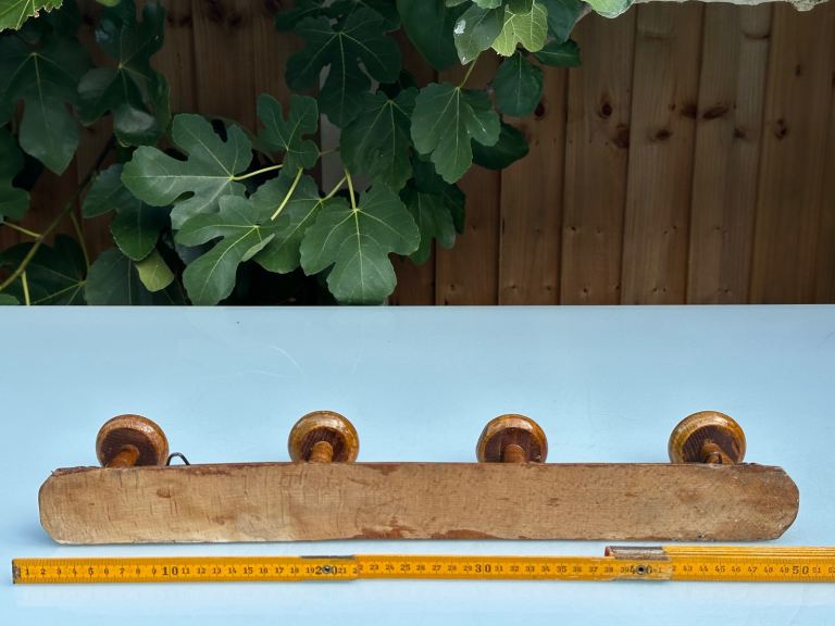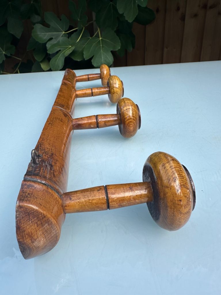 A robust and well made, nicely varnished, piece that has four secure mushroom hooks, it is now worn but still sound with a nice patina and makes a great functional and decorative piece.