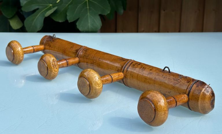 It’s an attractive four hook Faux Bamboo coat rack dating to around the 1920s.