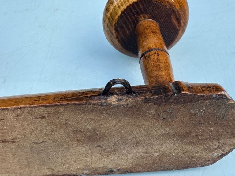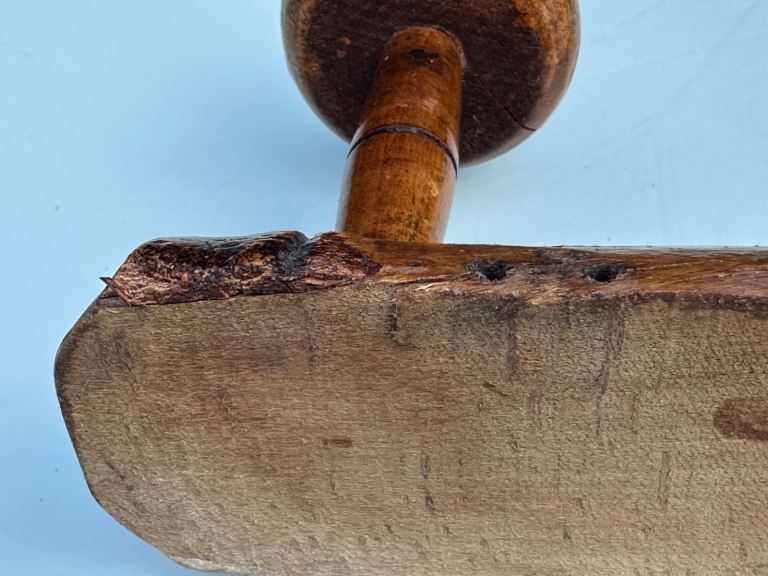 The bobbin hooks are turned wood “mushroom” hooks and are still sound and secure.