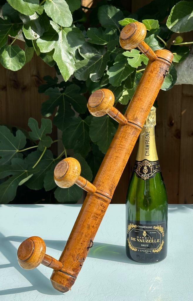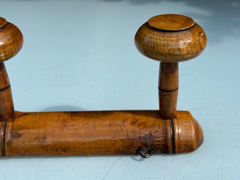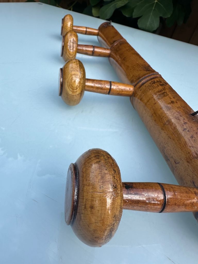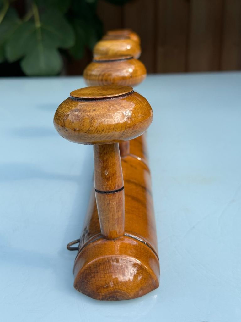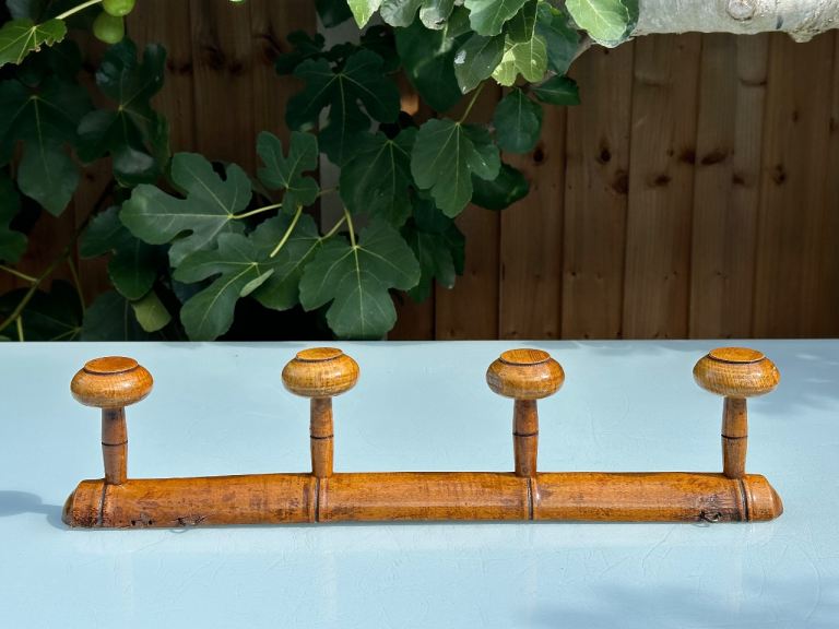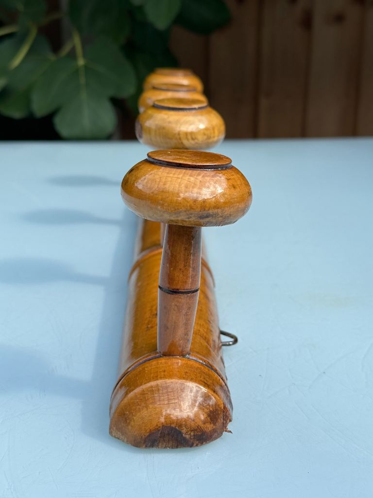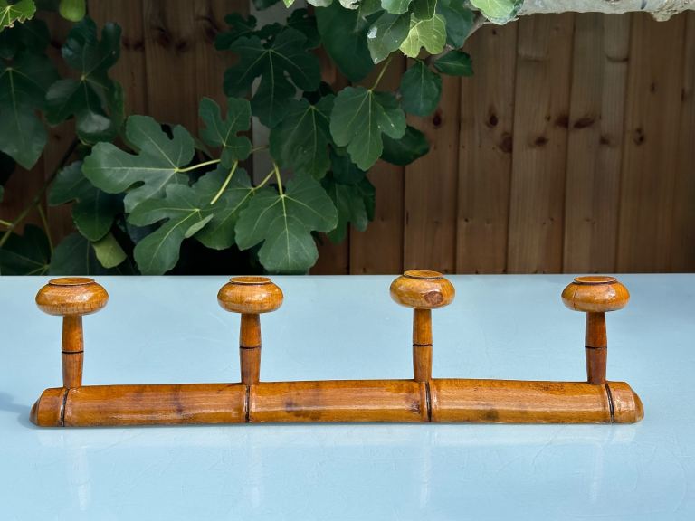 VINTAGE FRENCH FAUX BAMBOO COAT RACK, TURNED FRUITWOOD COAT HOOKS, FOUR HOOK HAT RACK, MUSHROOM HOOKS, 51.5cm long - 1920s - REDUCED!
