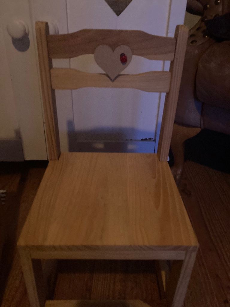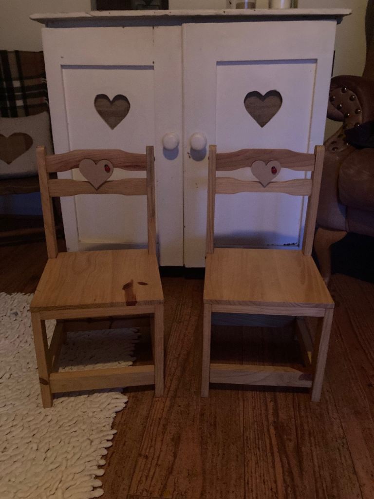 Old wooden cupboard. Has holes in the back so can be used as a tv stand cabinet. The top is 83cm x 57 cm. Could possibly deliver if local. £75 Could also be used as toy cupboard and have two co ordinating children’s chairs and £100 for all three items .