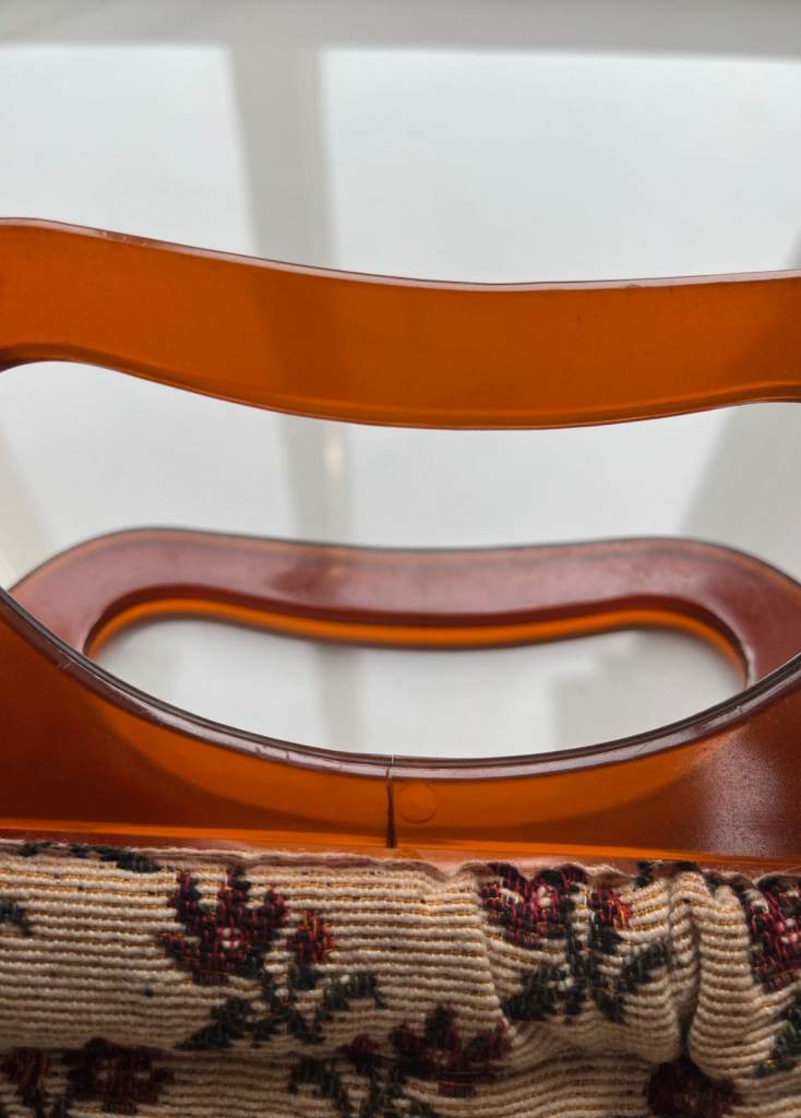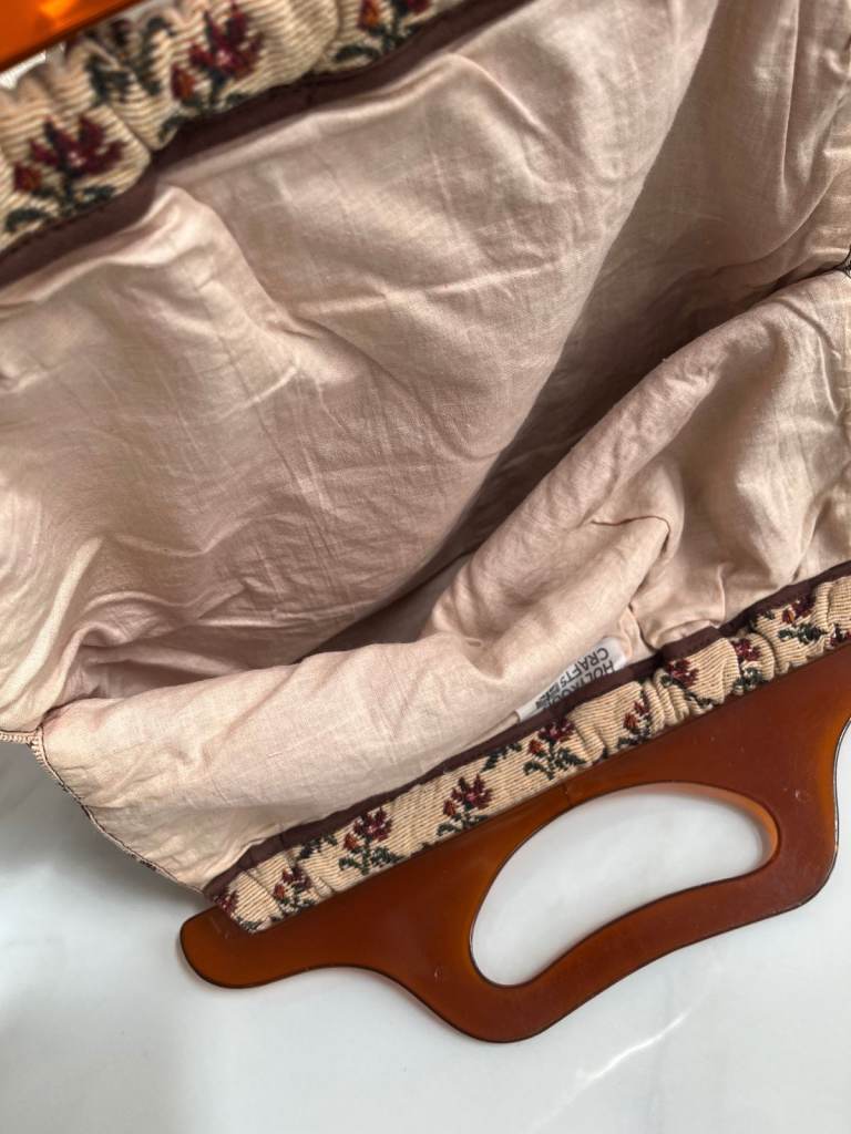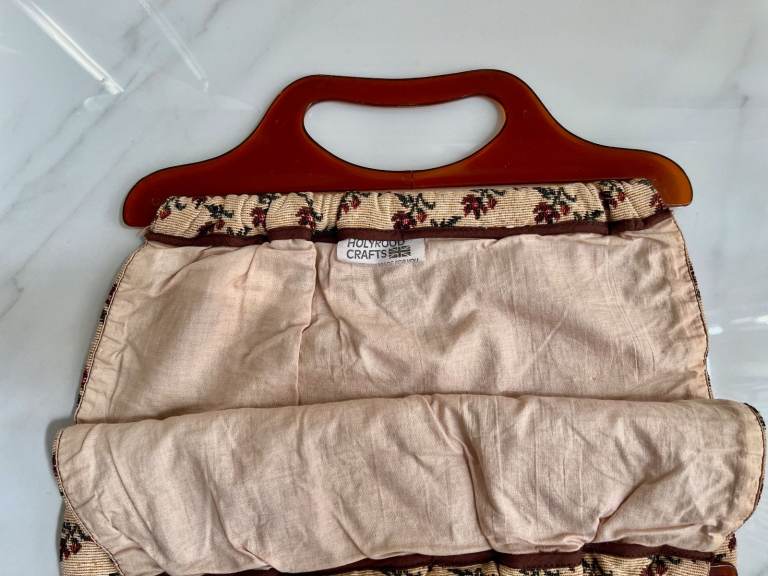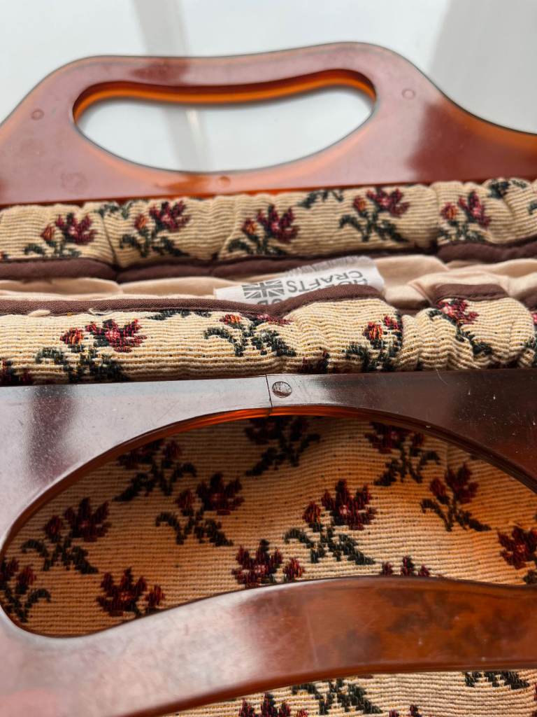 A retro vintage cream floral tapestry wool/craft keep bag by Holyrood Craft. It features tan brown bakelite handles and has a fawn cotton lining and is in Great Condition! Please note there is a tiny hairline crack in one underside handles as pictured but nothing major.
