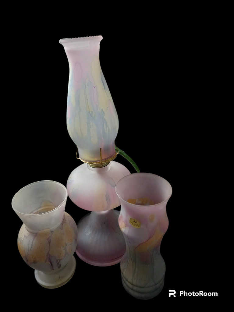 Vintage Israeli Hand Painted Satin Finish Drip Art Glass Oil Lamp & Vases x 2
