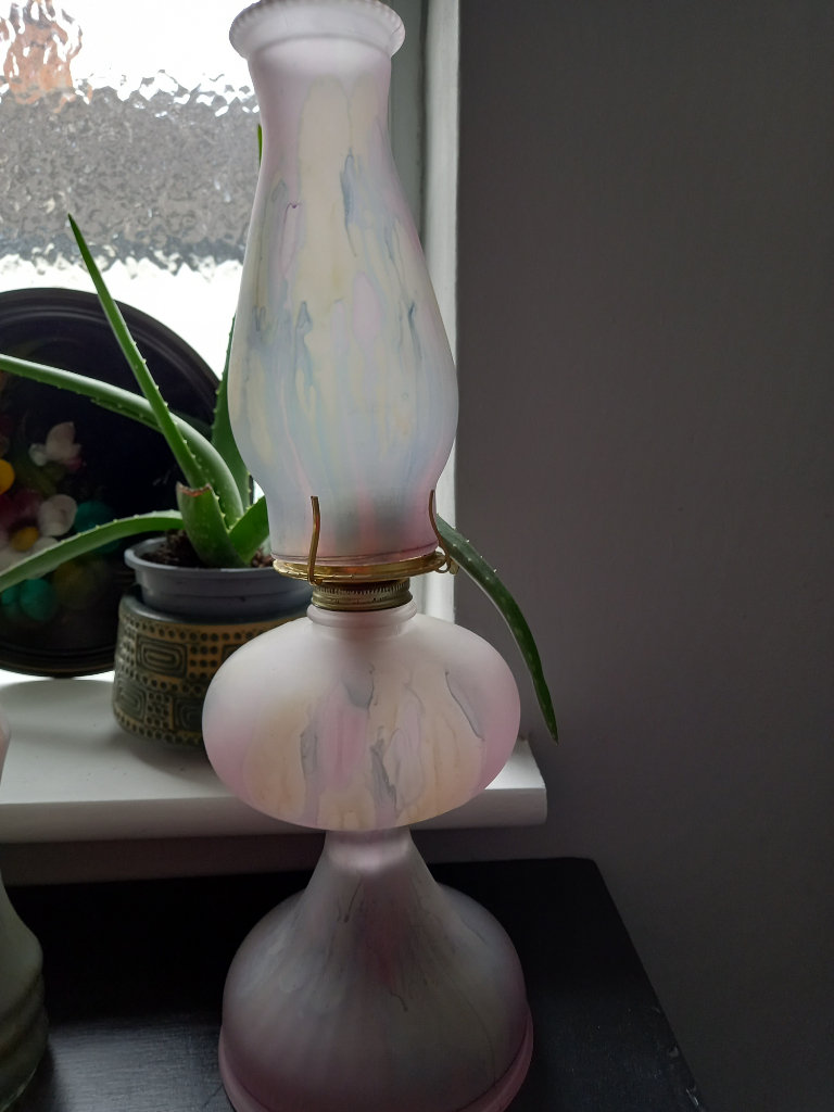 the lamp has never been used all in lovely condition. handy in a power cut!!