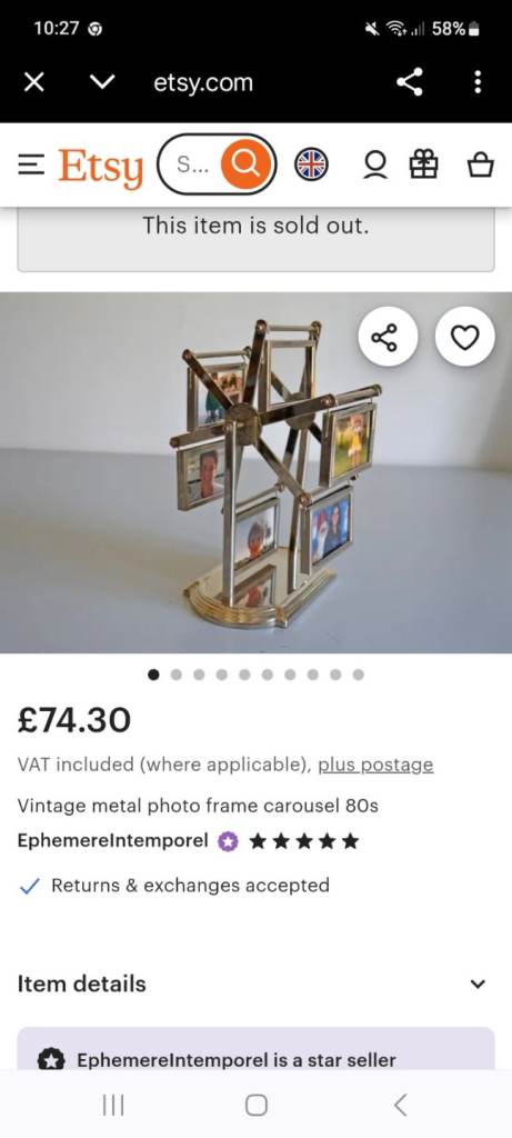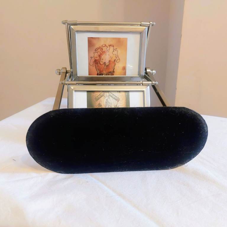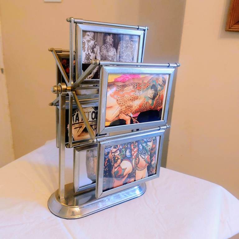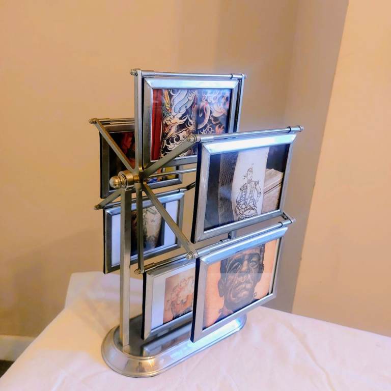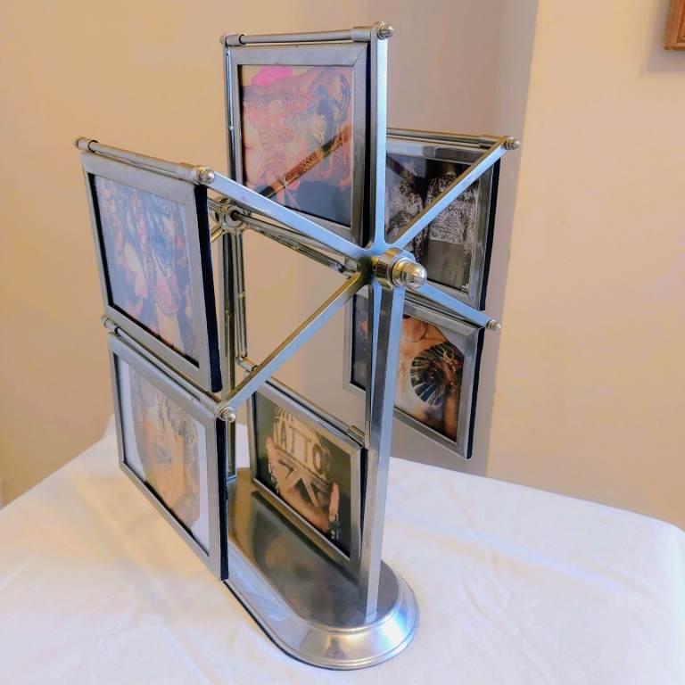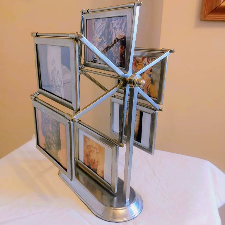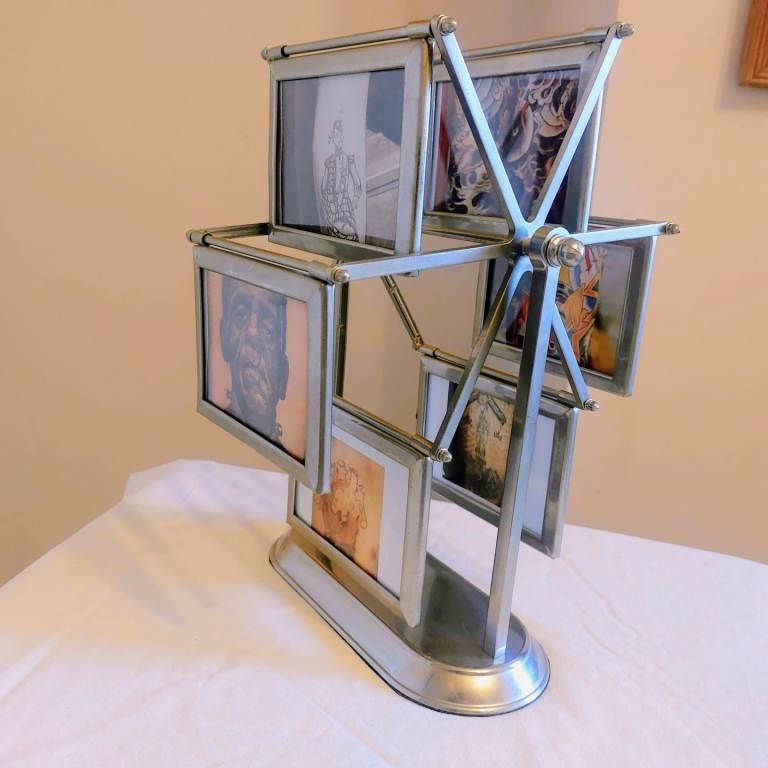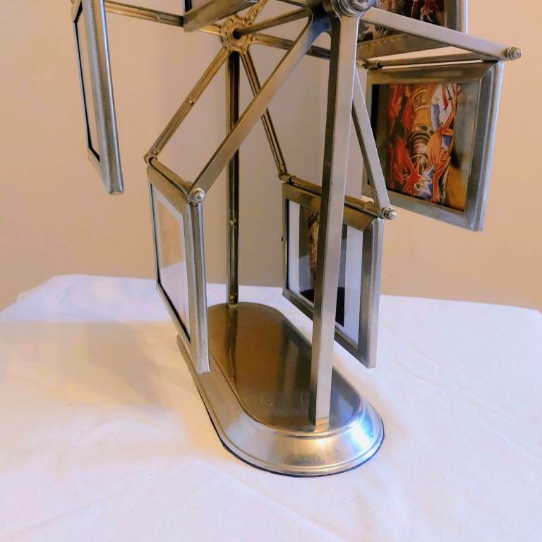 A gorgeous vintage 1980's grey metal rotating ferris wheel designed double sided photo frame