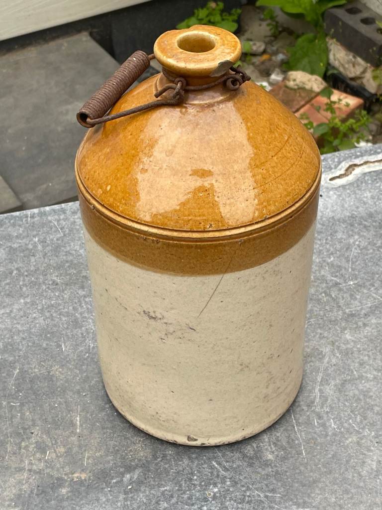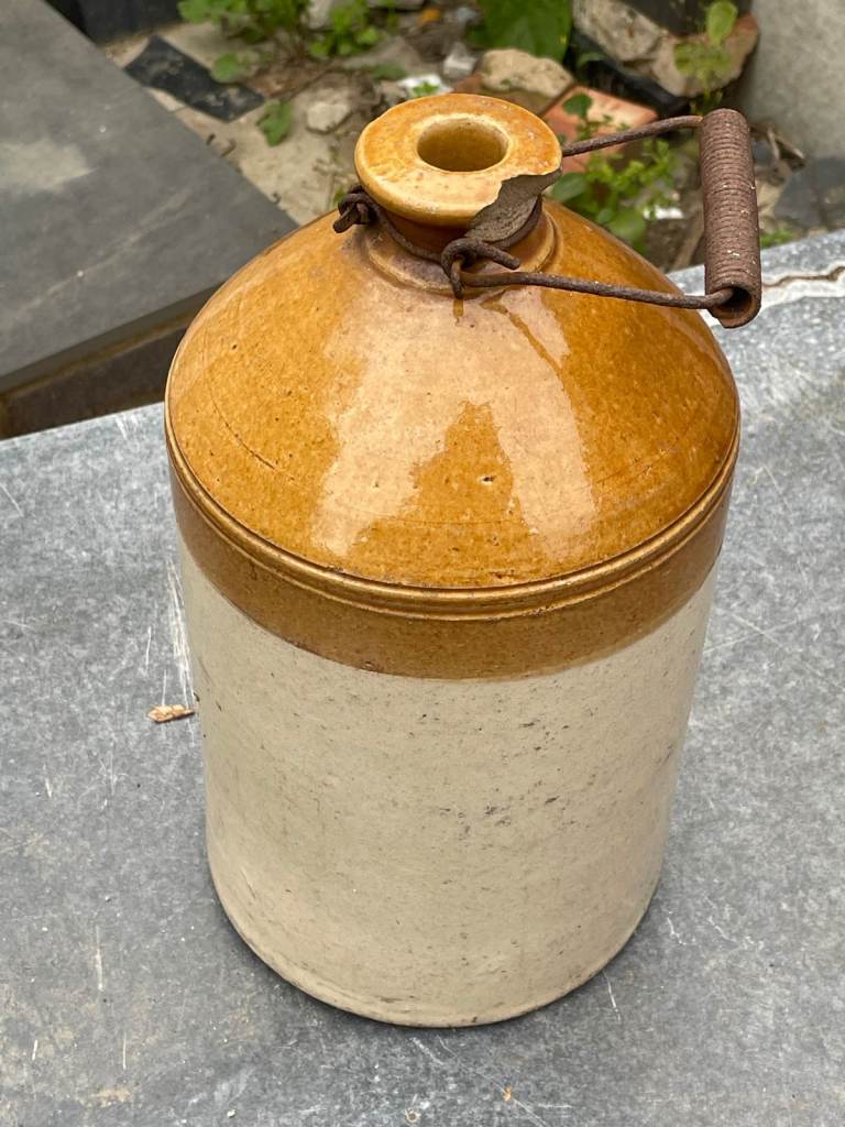 Stoneware Demi with rusted handle and damage around the top.