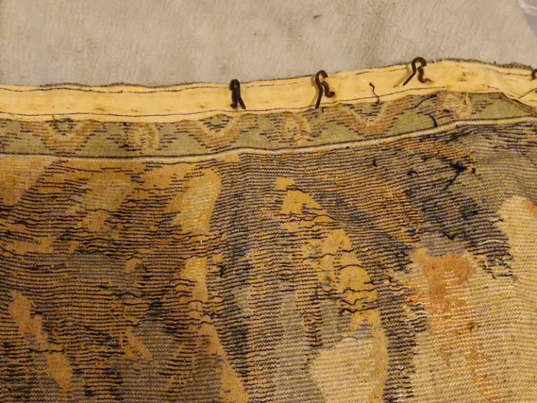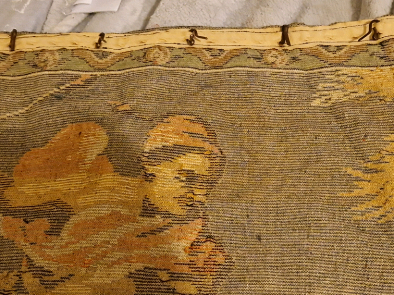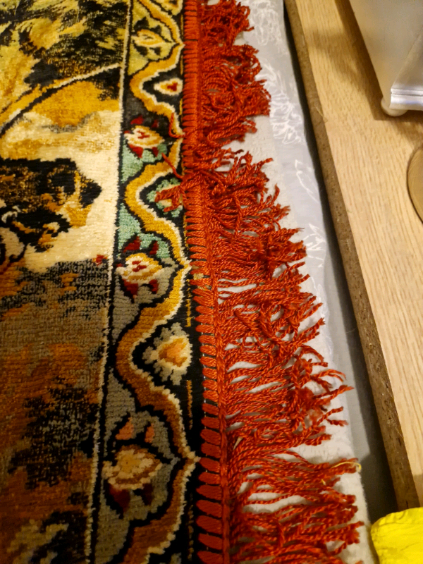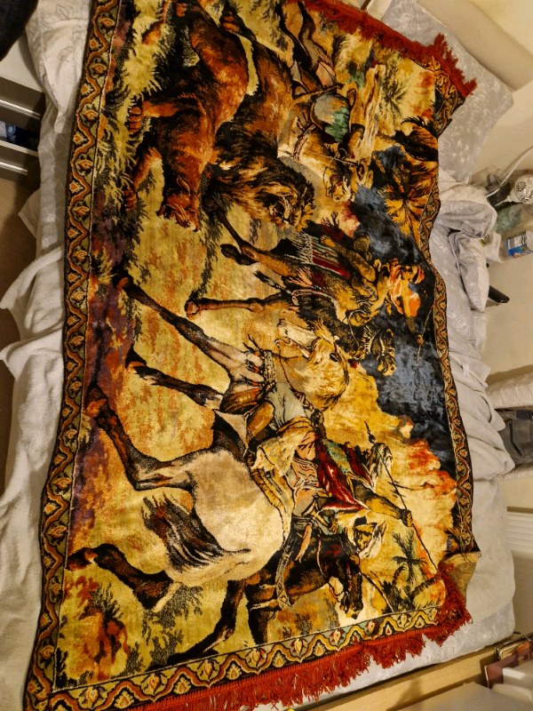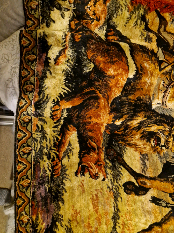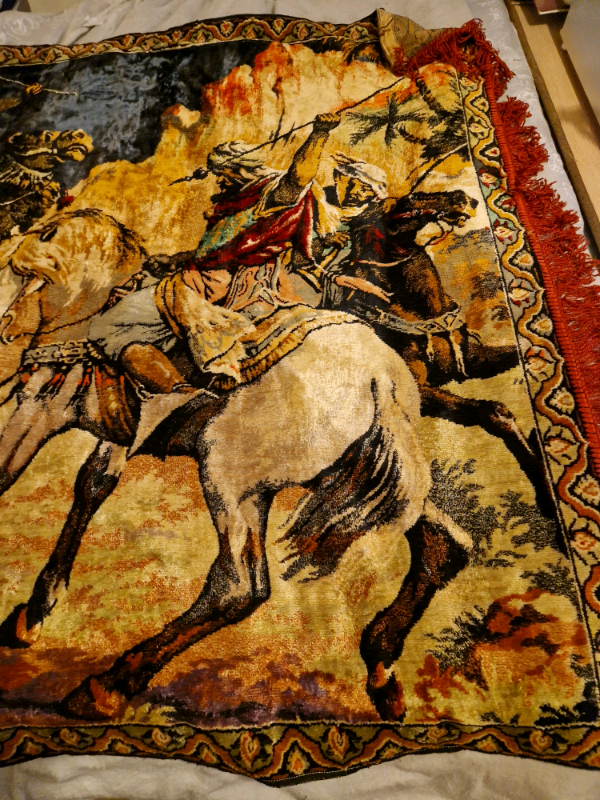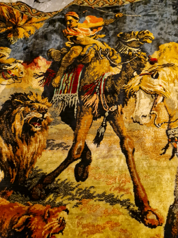 Vtg Tapestry Middle Eastern w/ Men On Camels & Horses Arabian Lion Hunting 68x48..