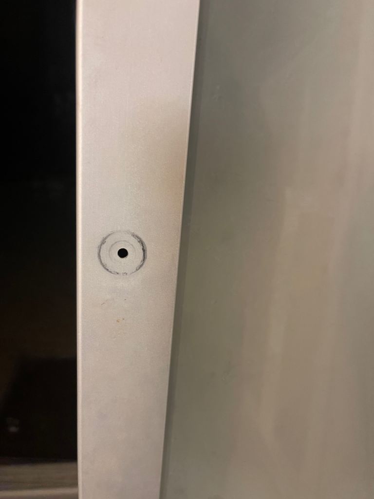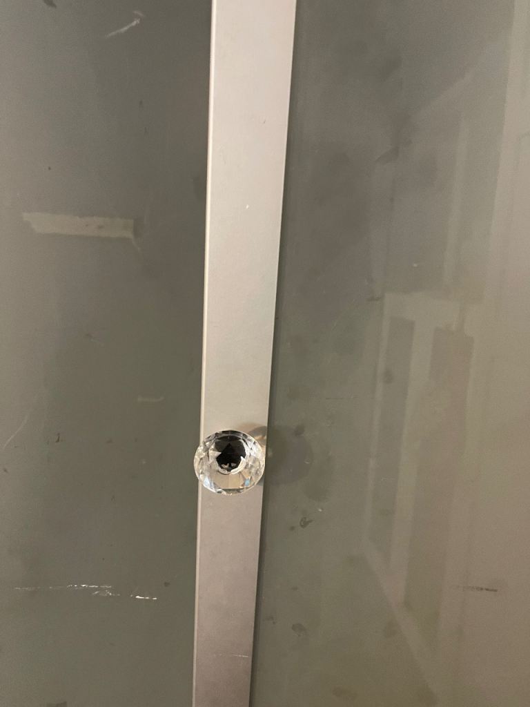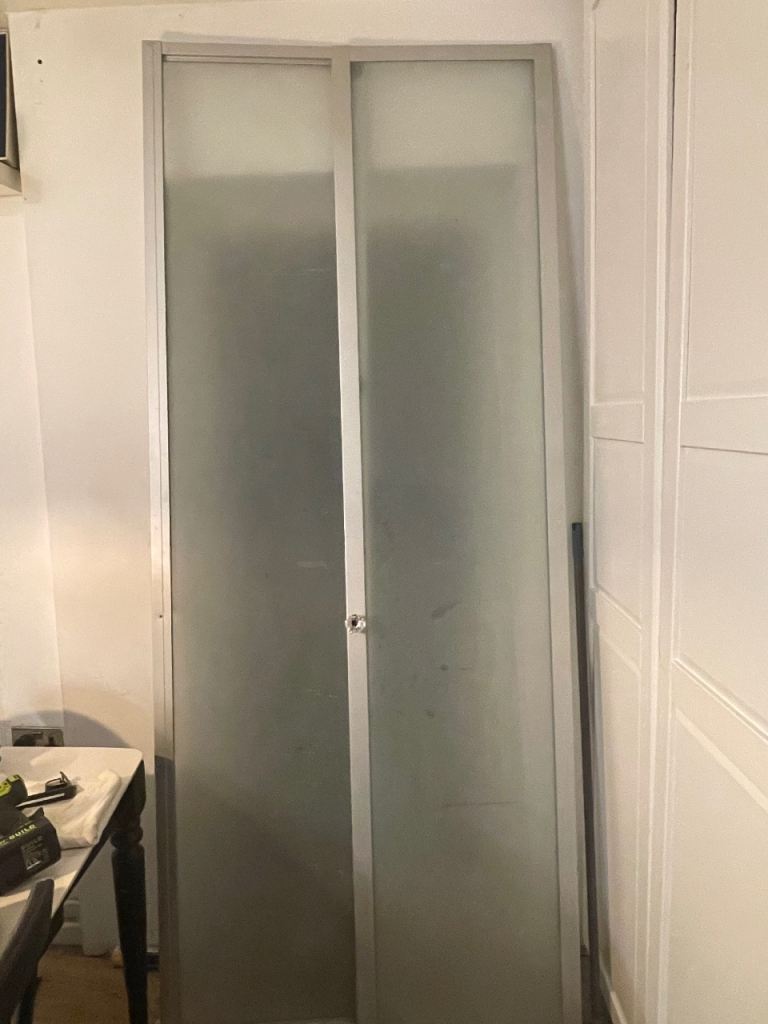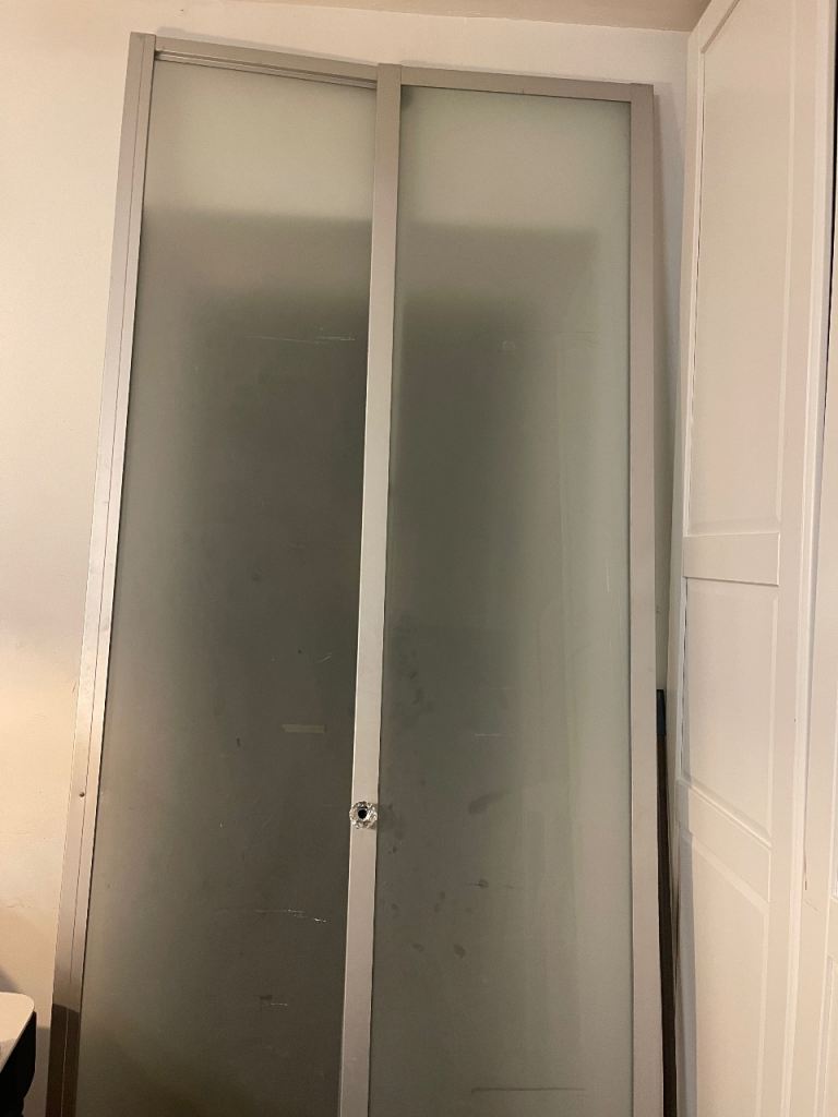 Used in storage room. Frosted glass with stainless steel trim. No longer available in IKEA.