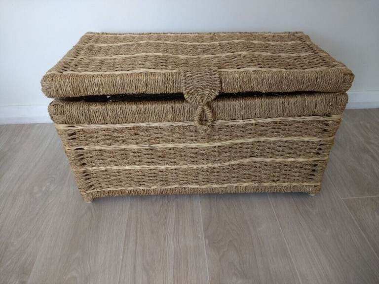 Medium wicked basket for sale. Never used, bought as a hamper box. Beautiful detail, handles at either side and there are feet on the bottom. Dimensions: 65.5cm x 35cm x 36cm