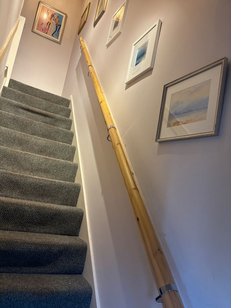 2 x wooden handrails for sale. Can be sold separately or together.. 3.6m in length. 50mm diameter. I have unscrewed and each one comes as 2.4m + 1.2m to make transport easier.