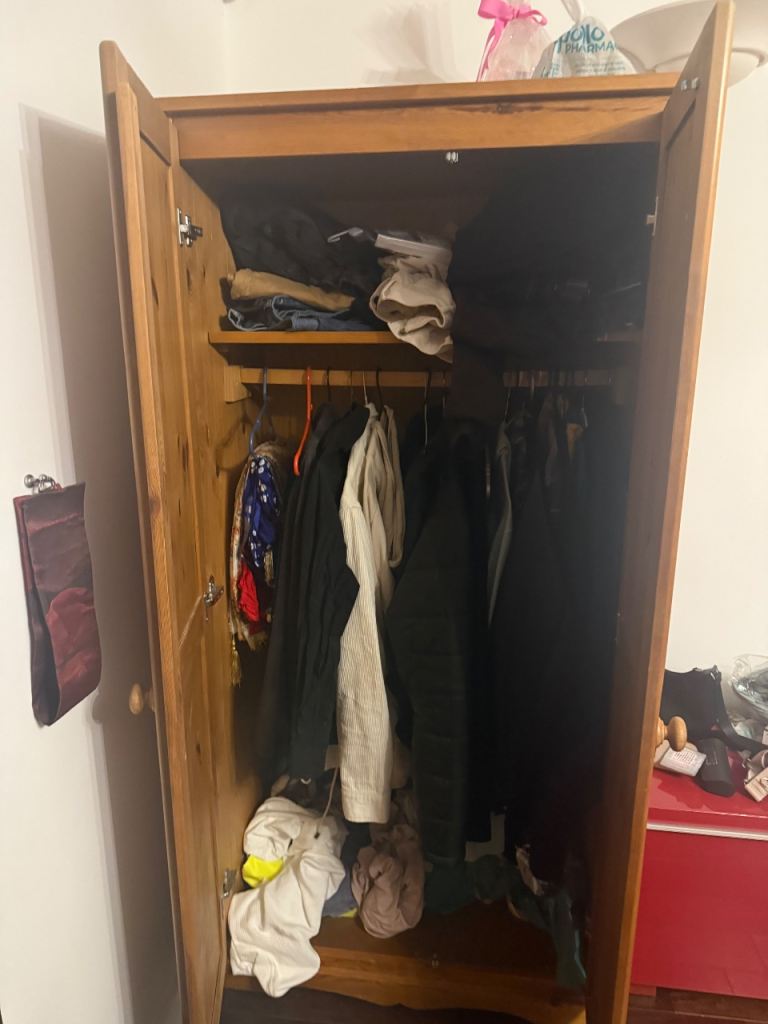 A freestanding wooden wardrobe with two paneled hinged doors and round wooden knobs. Inside, it has a single hanging rail across the width and a fixed shelf above it. The top forms a flat surface for storage.