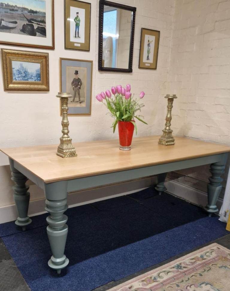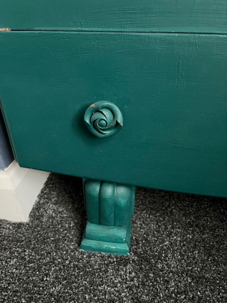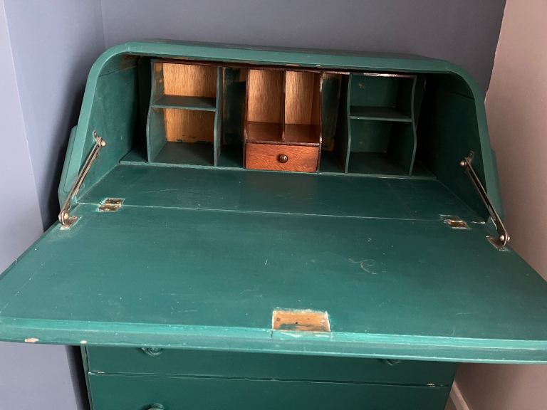 Quirky and practical writing bureau. Three drawers and a lid that folds down to make a desk. The top drawer is a little stiff, but this just needs a light sand to make it good again. It has been painted with chalk paint which is chipped in places and could do with some love overall. Lovely rose shaped handles and carved feet. Collection from Adamsdown. Cash on collection. £25