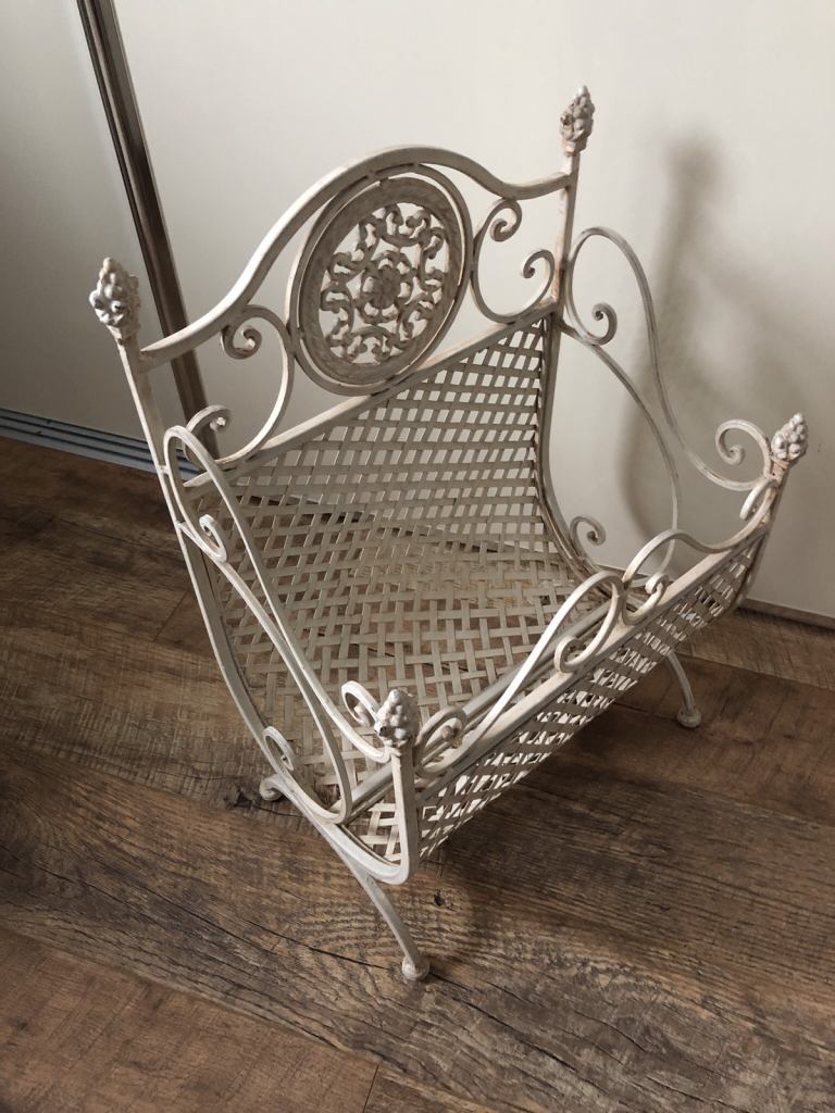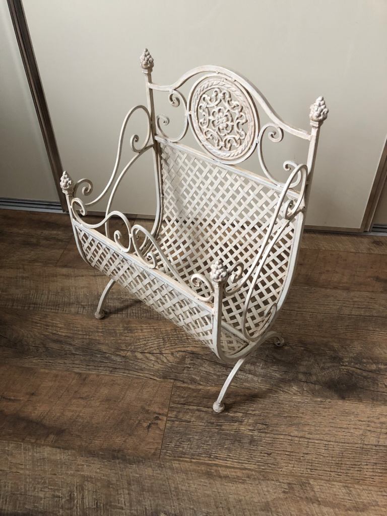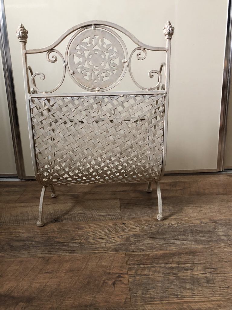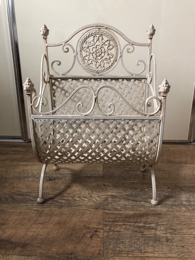 Wrought Iron magazine rack. Painted shabby chic white. Sturdy.