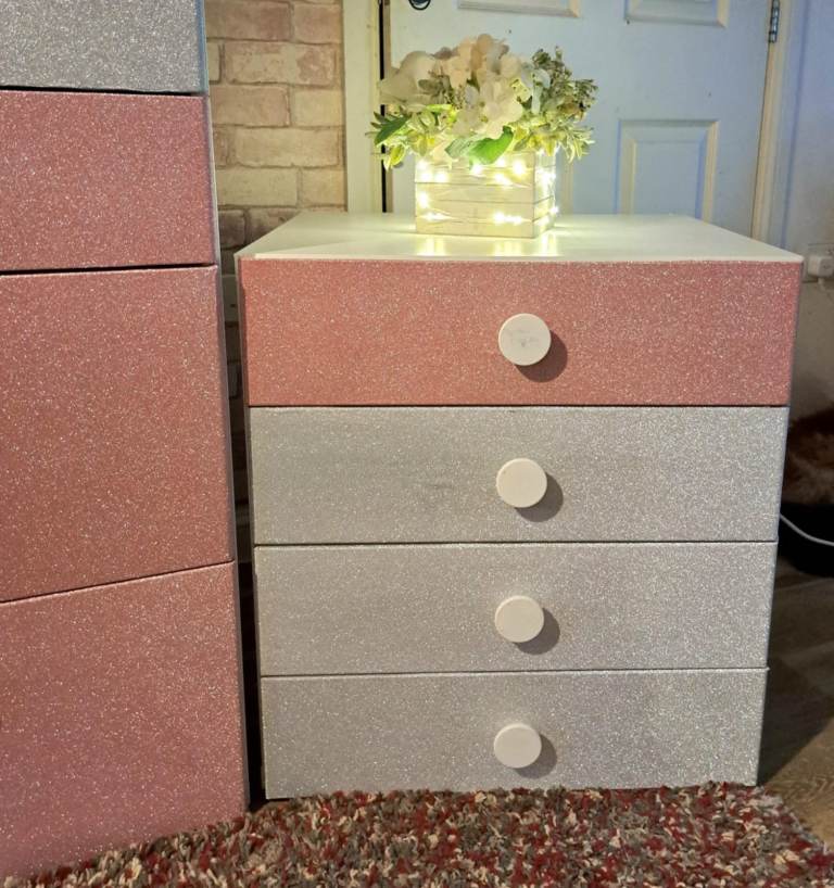 A pair of white chests of Drawers one tall 6 drawer one smaller but very heavy 4 Drawer, all fully functioning drawers which have previously had the drawer fronts covered in glittery silver and pink sticky back covering,