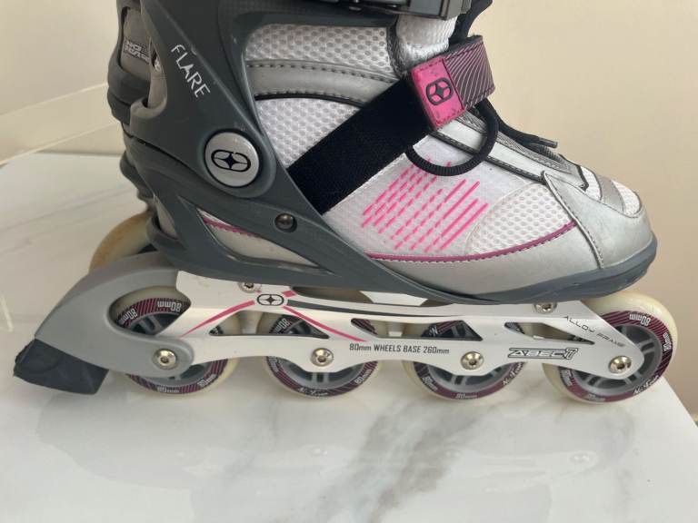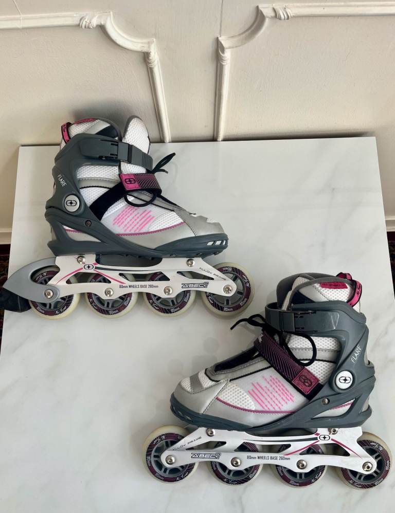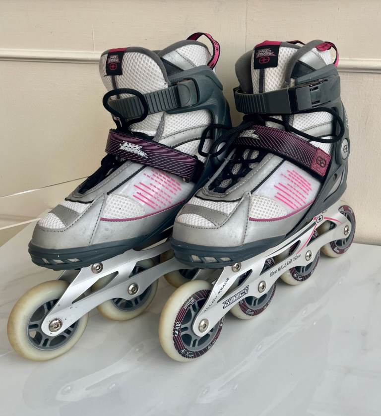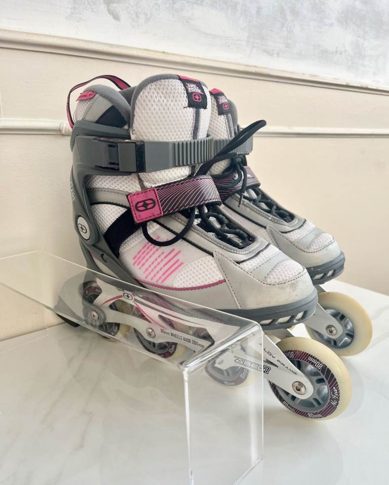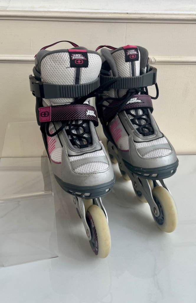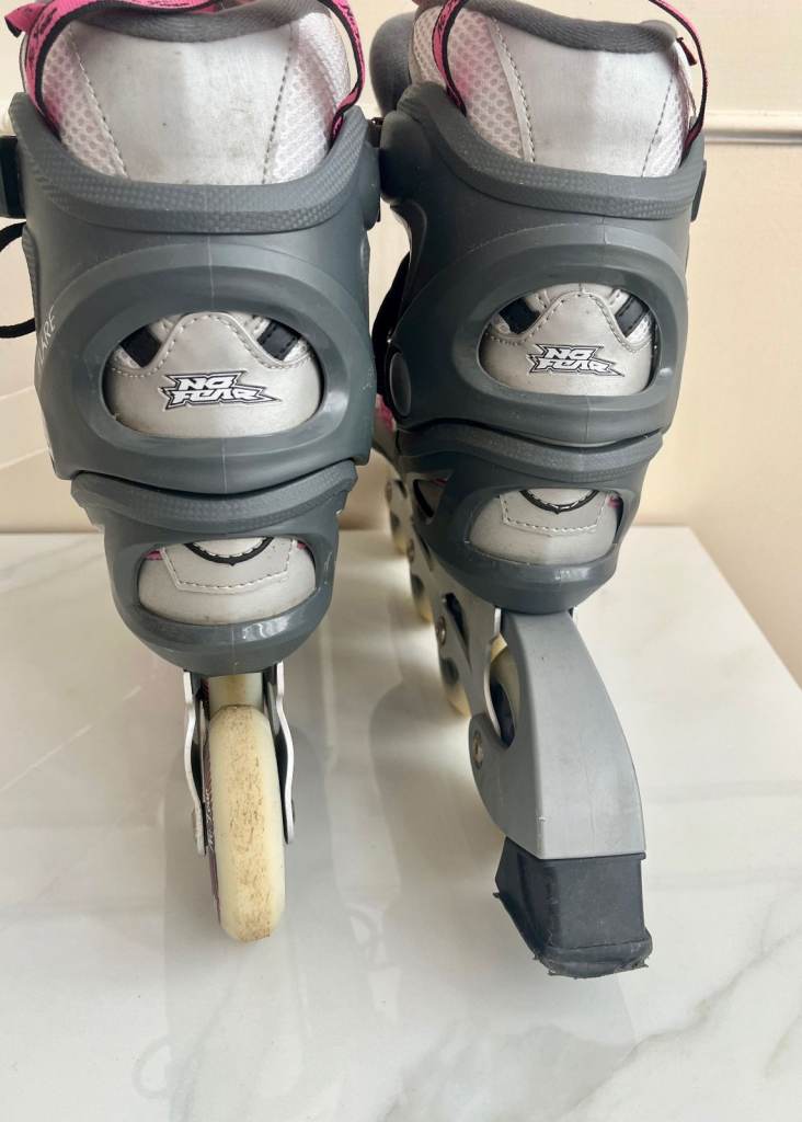 A pair of grey, white and pink inline skates by No Fear. They have 80mm alloy wheels with one rear brake and have adjustable velcro ankle supports. they have a couple of minor scuffs but nothing major.
