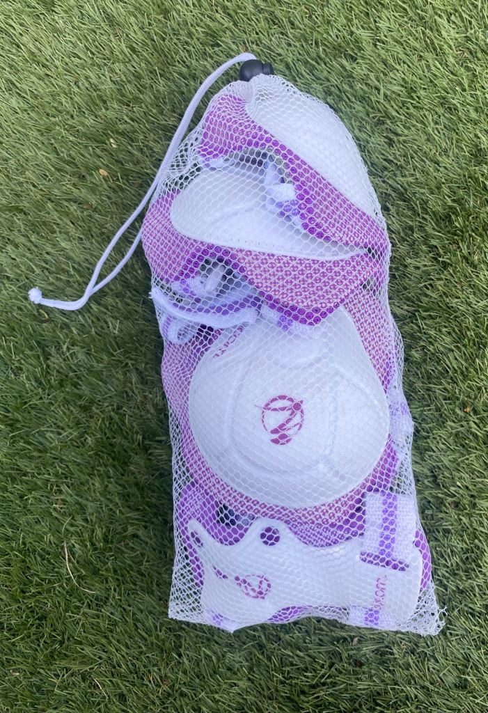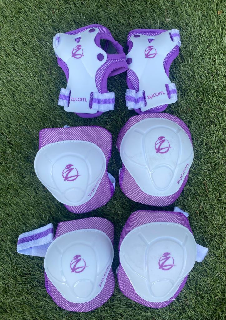 Comes with colour coordinated knee pads, elbow pads & wrist protectors, in a mesh bag.