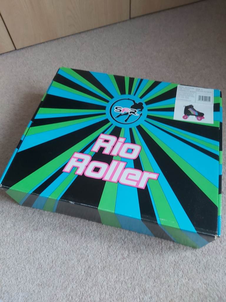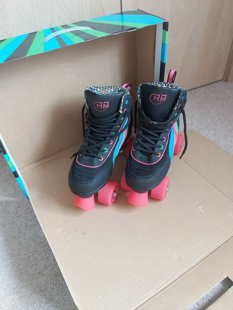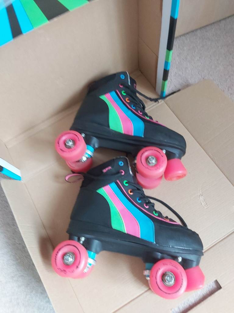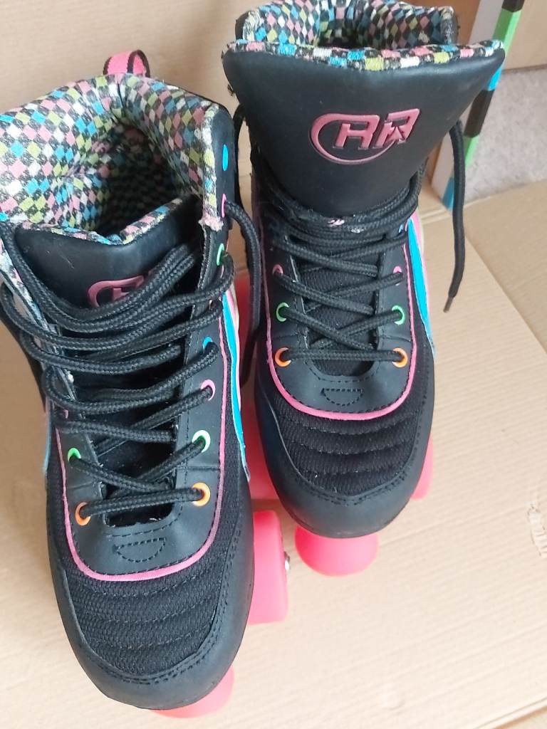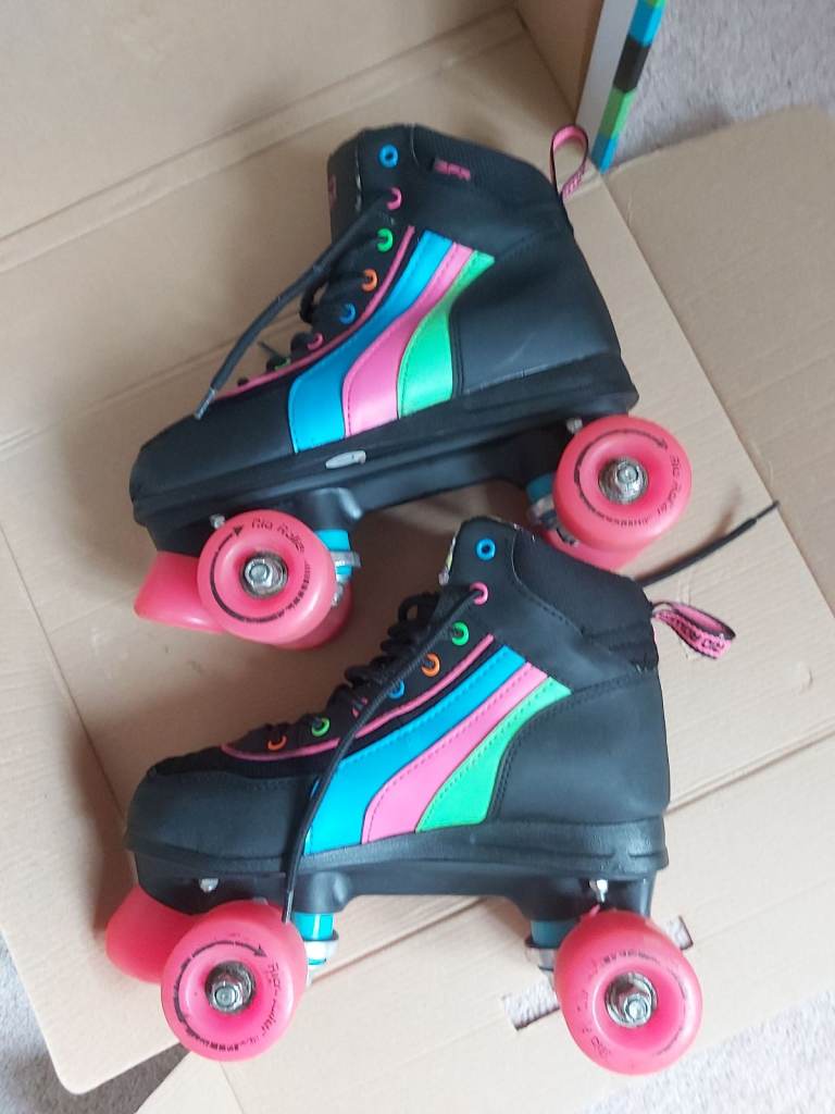 Rio Roller Skates. Size 5, quad style skates. Hardly used. Black boot and chassis with colourful stripes and lace eyelets. Pink wheels and stopper. One stopper slightly worn otherwise in near perfect condition. Comes in original box. Similar brand skates currently retailing between £60- £90. Looking for £29