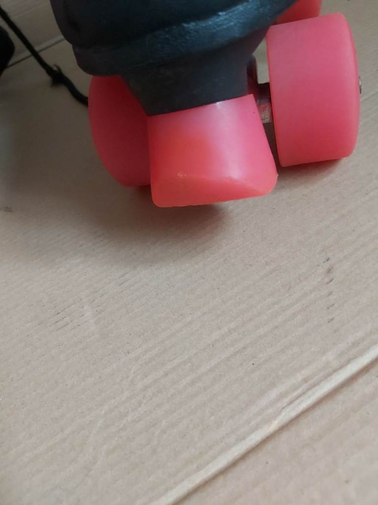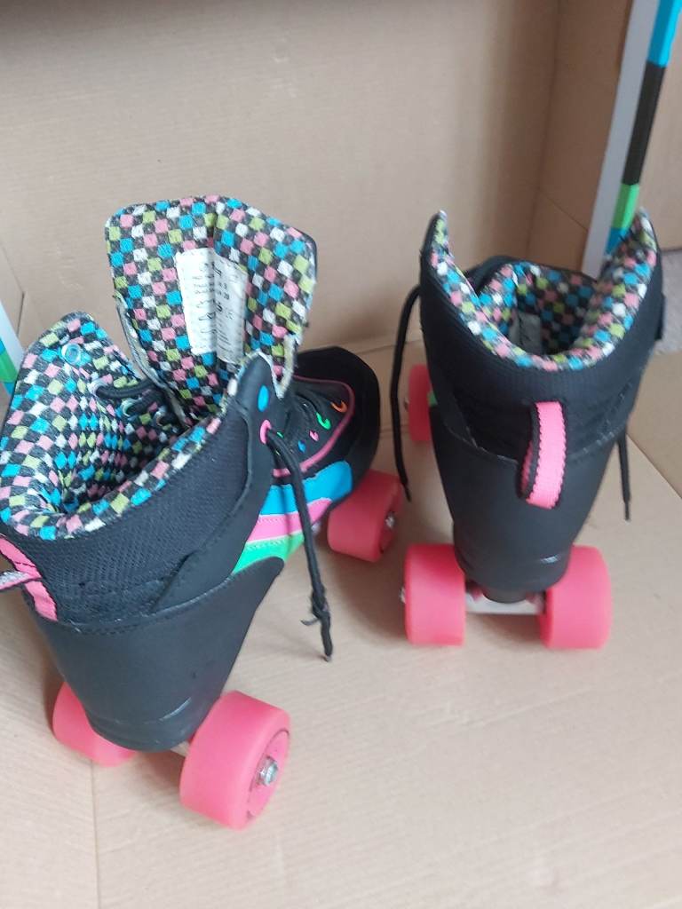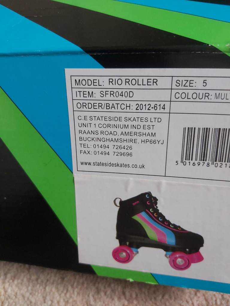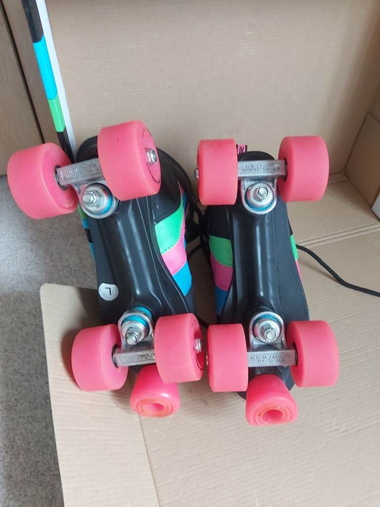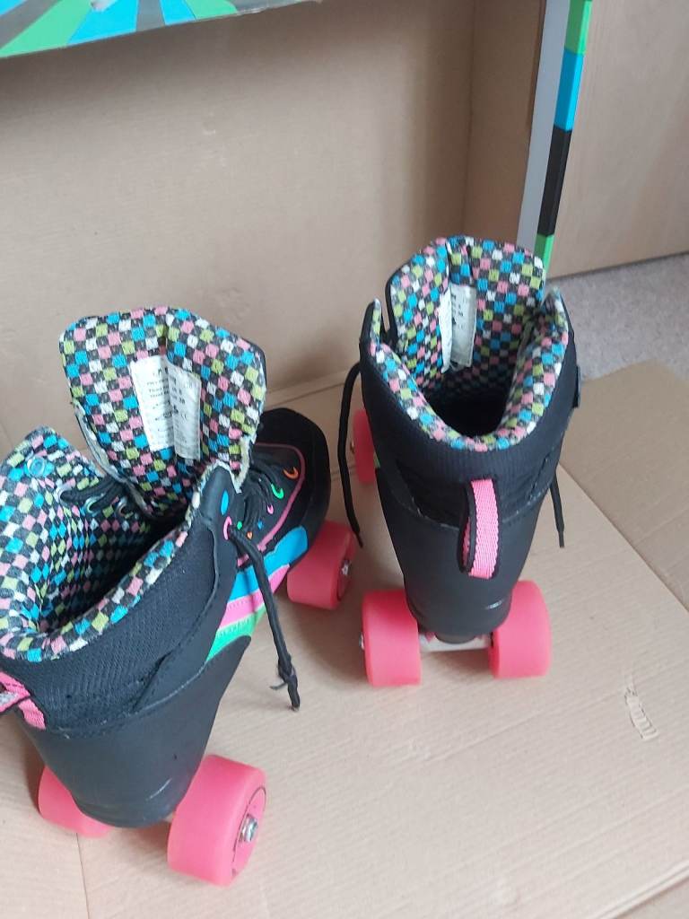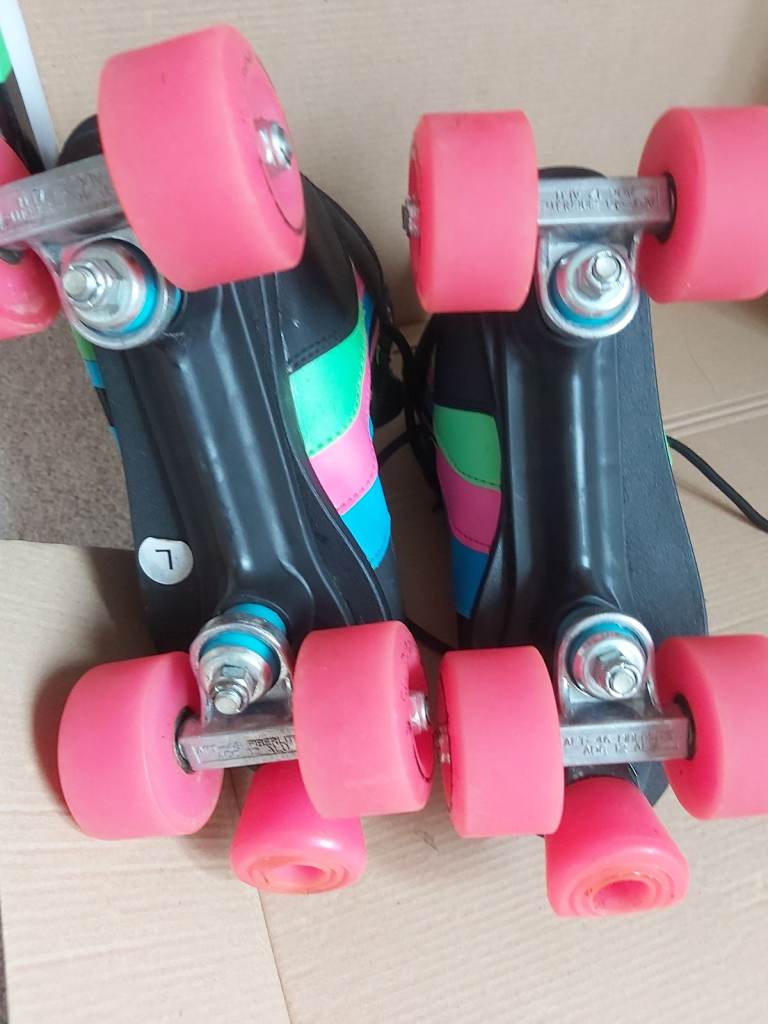 Rio Roller Skates. Size 5, quad style skates. Hardly used. Black boot and chassis with colourful stripes and lace eyelets. Pink wheels and stopper. One stopper slightly worn otherwise in near perfect condition. Comes in original box. Similar brand skates currently retailing between £60- £90. Looking for £29
