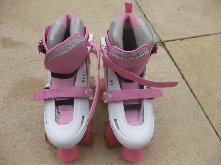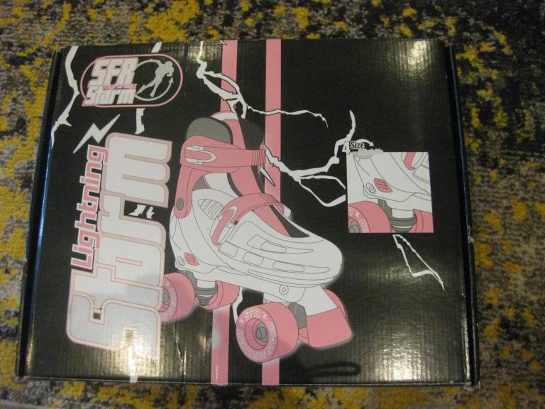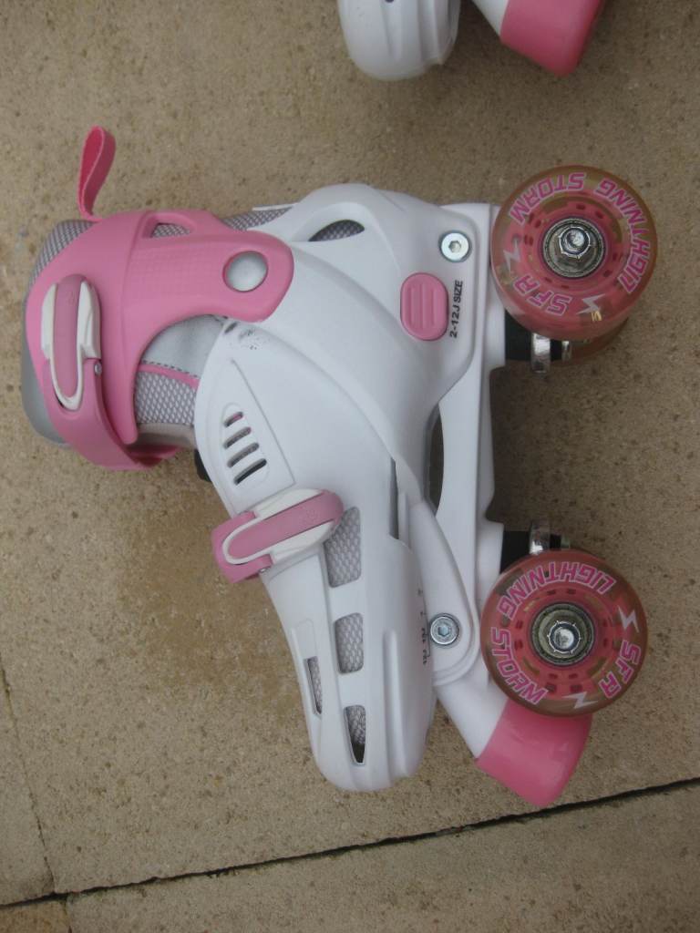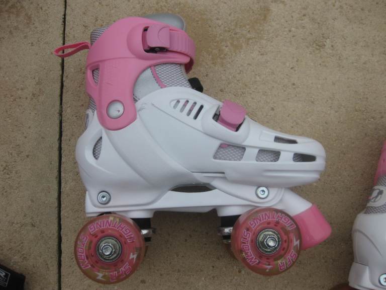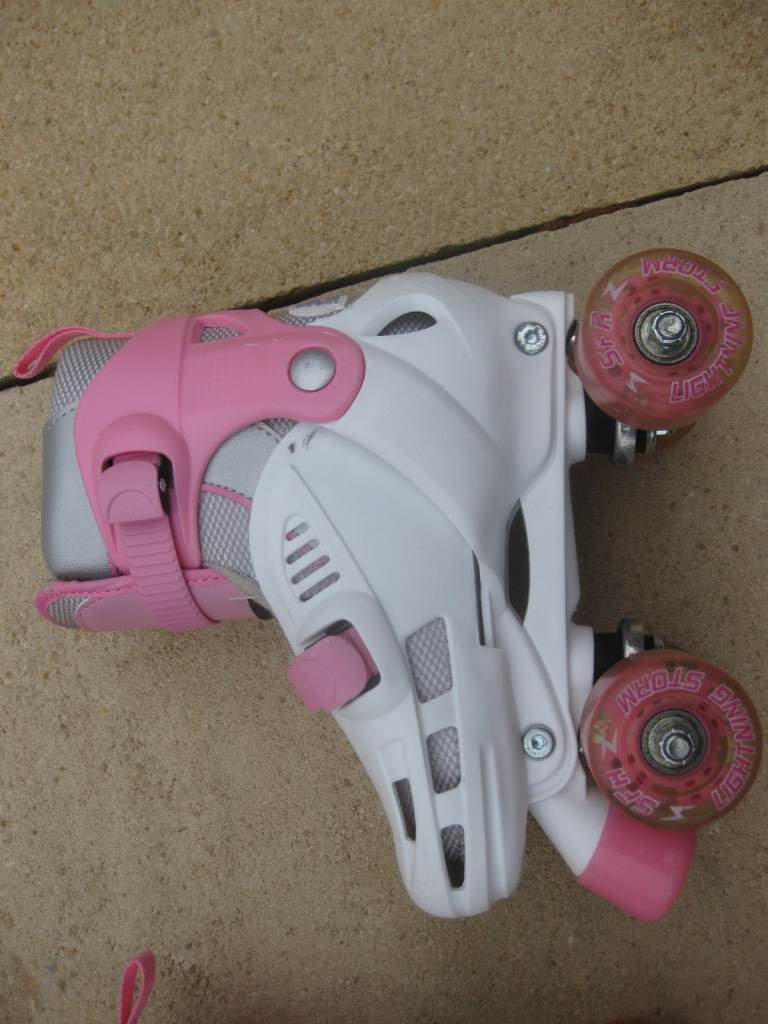 The SFR Storm skates come with flashing wheels that light up as the skate is rolled. Also fitted with an easy to use size-adjuster system; simply press in the locking button and slide the skate to increase or decrease the size, meaning that the skates can grow with your feet. white/Pink with printed graphics on the liner and colour coded straps.