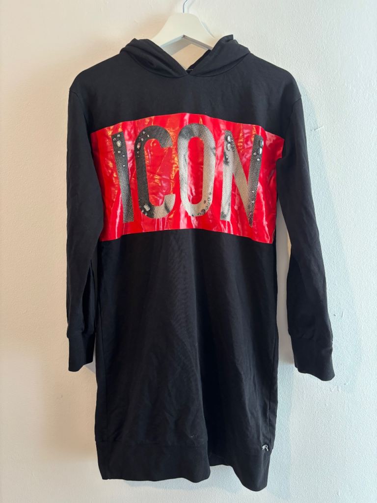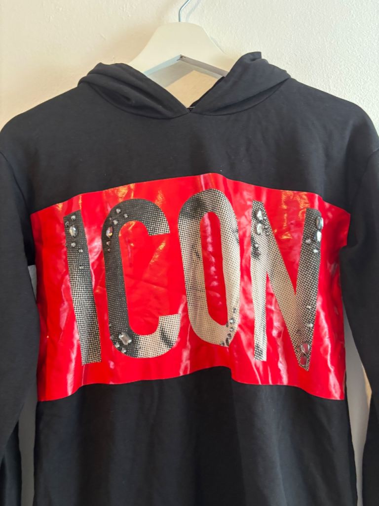 Black long‑sleeve hoodie with bold red front panel and metallic studded “ICON” lettering. Soft cotton feel with a relaxed, comfy fit.