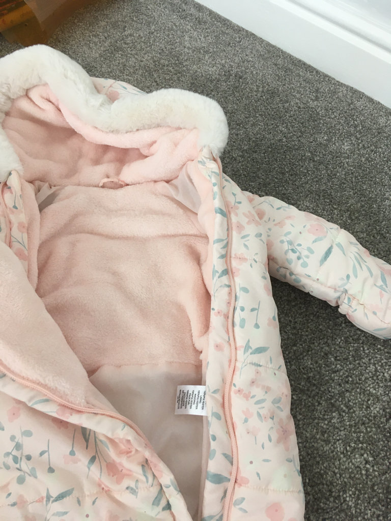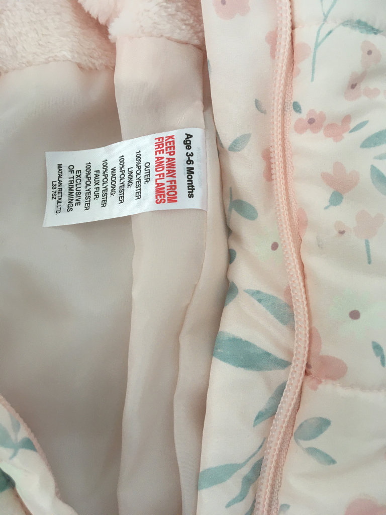 Girls all in one suit pink flowers 1/2 fur lined double zip mitts included age 3 to 6 months but looks bigger