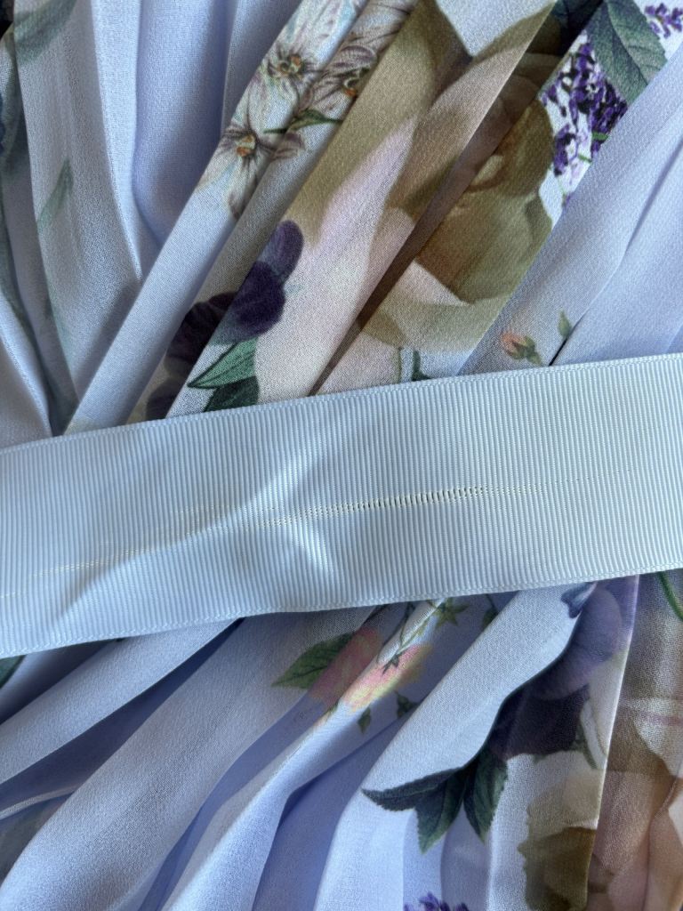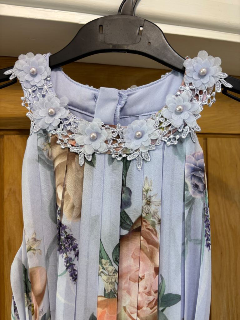 Worn once for a wedding. Lovely detail to neck. Pleated throughout. Hand washable. Minor fray to the ribbon belt (see photograph) - this could be replaced but not noticeable and just noted a small snag to the bottom - see photo - again not noticeable and could be stitched. A light blue/ lilac shade. Fully lined. Elegant. For collection only.