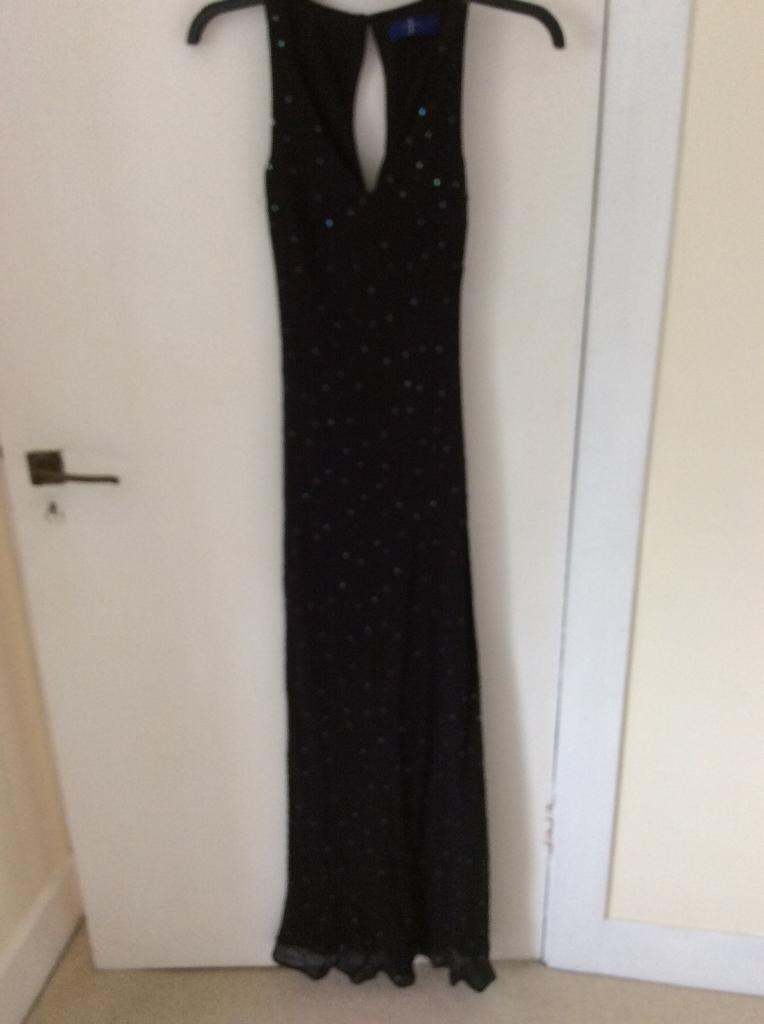 This slinky dress shimmers. size 10/12. In midnight blu and fully lined it is very soft to wear. 150cm from nape of neck to hem.