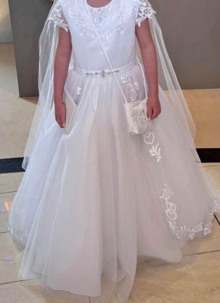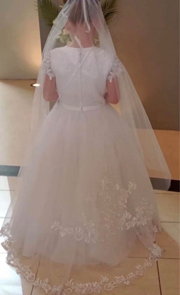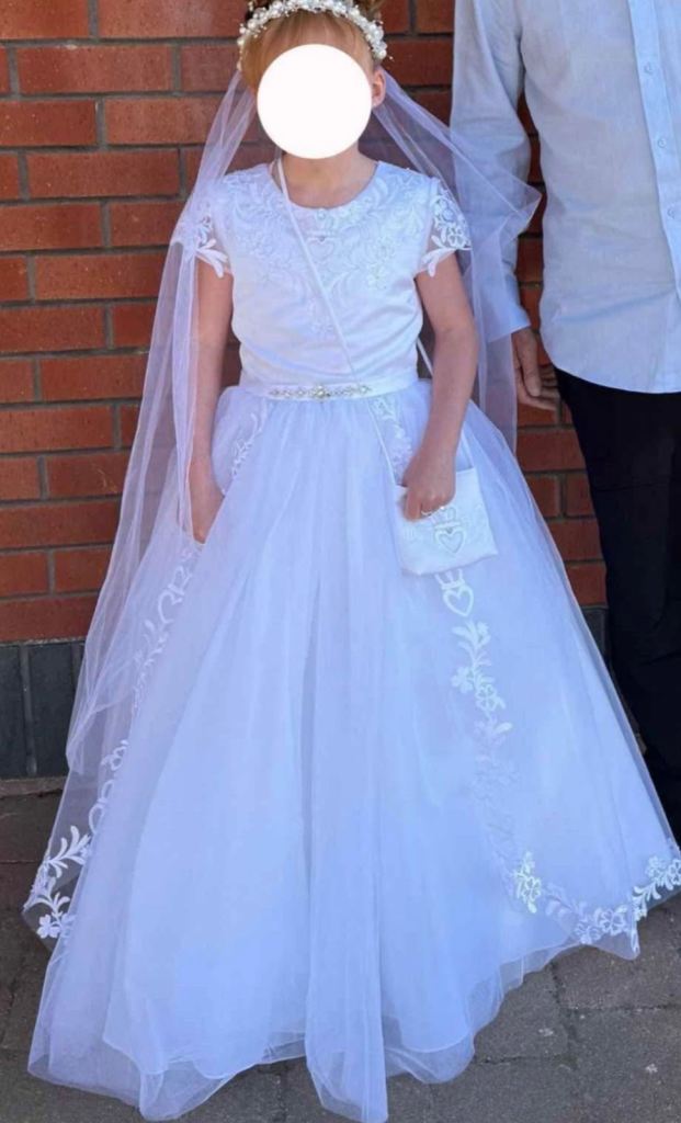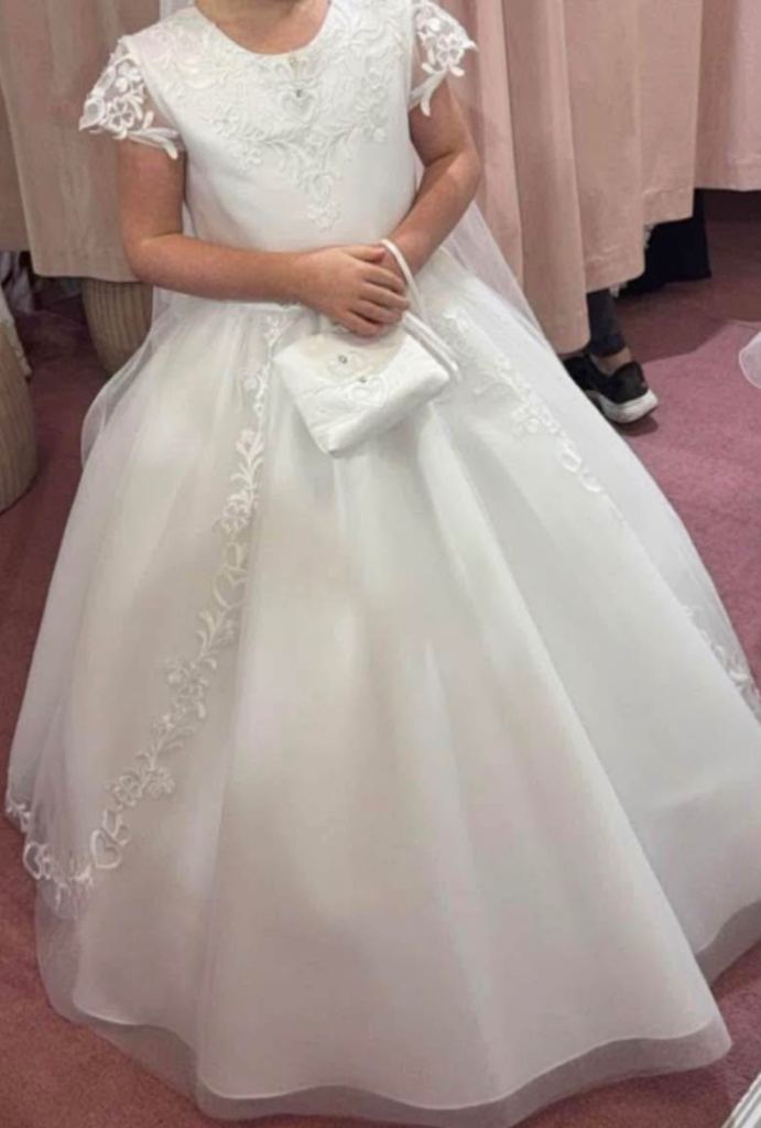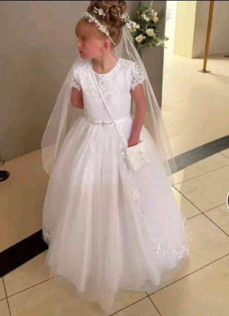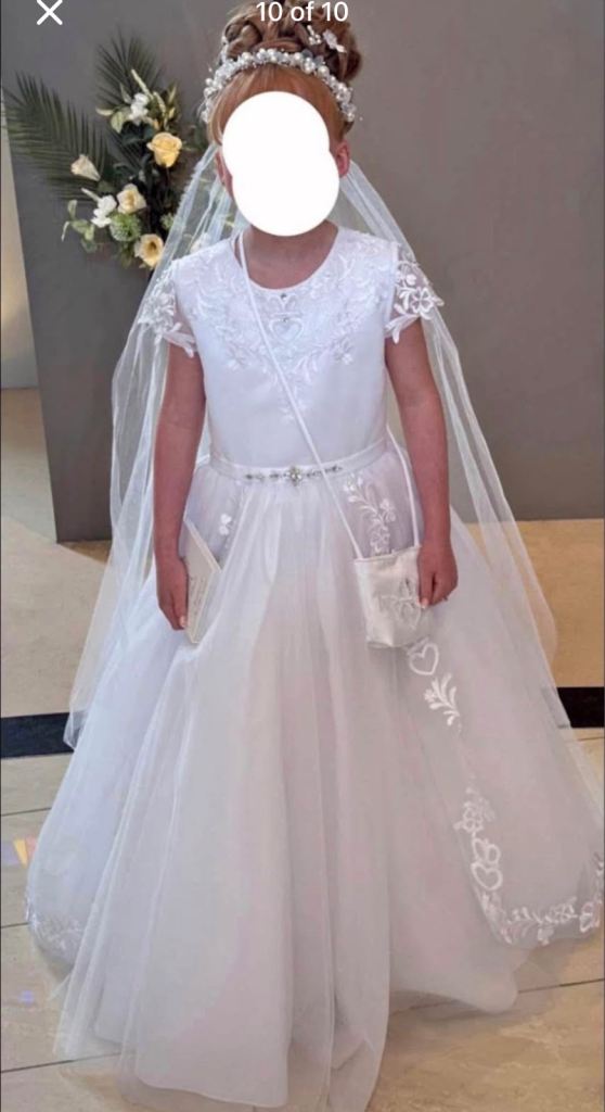 Comes with long Celtic veil, Celtic gloves, Celtic bag, several hair accessories, shoes size 1 , dress has also been dry cleaned!! No offers! Welcome to view