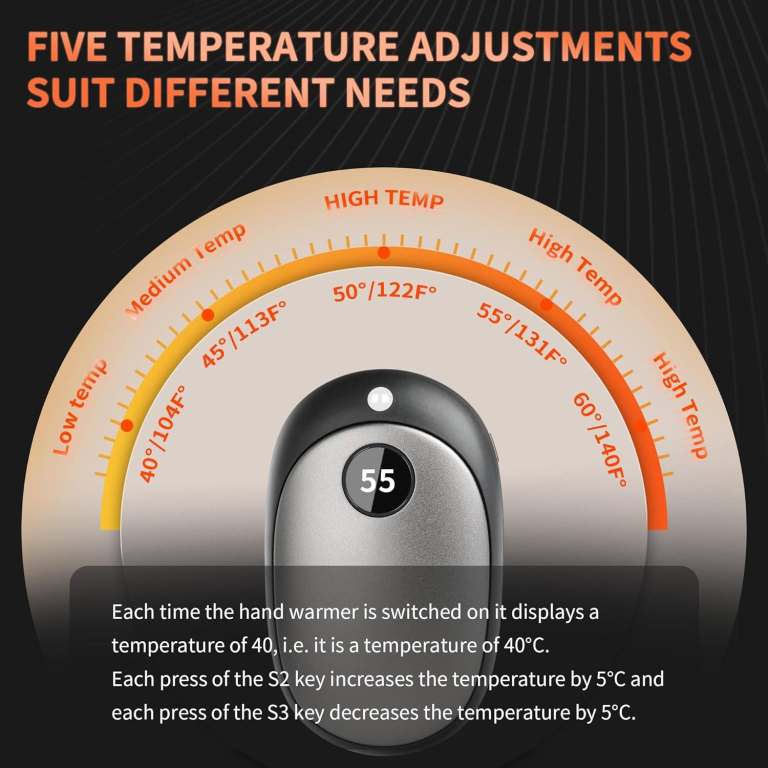 ADJUSTABLE HEATING LEVELS: No more cold hands, the Pocket Hand Warmer with double-sided heating, quickly heats up to 103℉ in 5 seconds. It offers both your hands full-scale warmth no matter whether Indoors or Outdoors. Whether you desire gentle warmth or intense heat, you can easily adjust the temperature according to your preferences, ensuring comfort in chilly weather conditions.