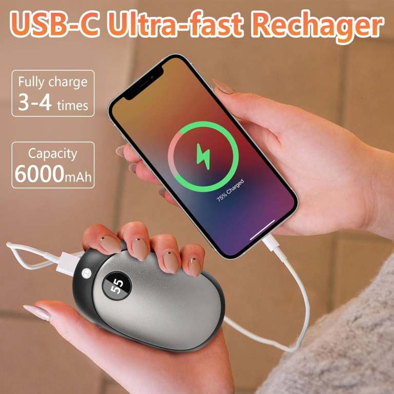 VERSATILE & CONVENIENT: The USB Hand Heater with a large battery capacity offers up to 4-8 hours of warmth. Quick charge only 2-3 hours. It can also be used as a Power Bank to charge your electronic device at any time. Easy to carry for Hiking, Travel or Outdoor Work. Featuring a USB Type C/USB Output Charging Port.