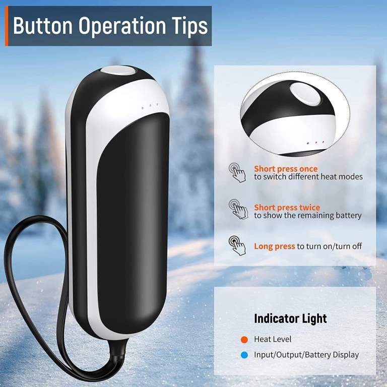 CAPACITY UPGRADE & TEMPERATURE SMART SWITCH: 6000mAh lithium iron phosphate battery is just right, it will not be too large to carry or the capacity is too small and the heat is insufficient. 3 indicator lights are always available to know the remaining battery power. The Hand Warmer is equipped with a velvet In the cloth bag, put the Hand Warmer into the bag to keep the temperature from dissipating. At this time, the Hand Warmer will suspend the heat supply to make the heat last longer.