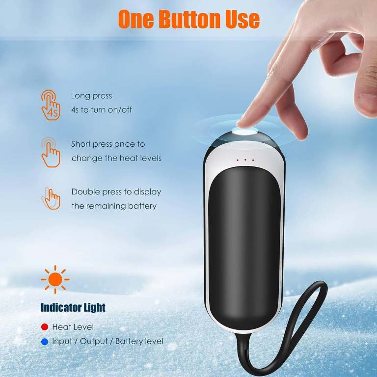 QUICK HEATING 3 SPEED ADJUSTMENT: The Reusable Hand Warmer has a Temperature Control Button & 3 Temperature Levels. It only takes 5 seconds to heat up and warm the sides of your hands. Just choose between 3 different heating settings of 95-108°F (low)/108-118°F (medium)/118-131°F (high), press the switch, and keep heating your hand 5 -10 hours. In Winter, your favorite outdoor activities will not be blocked by cold fingertips.
