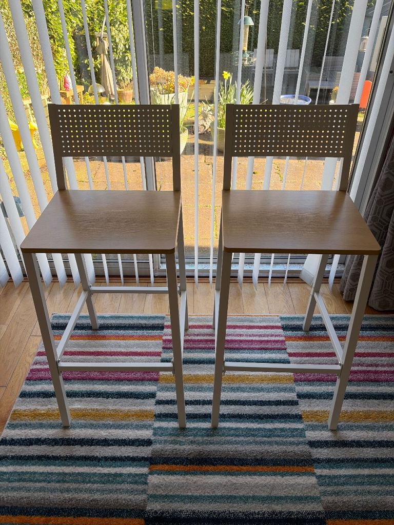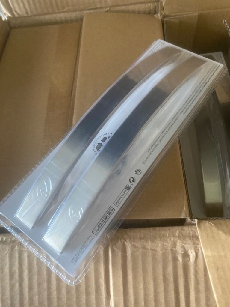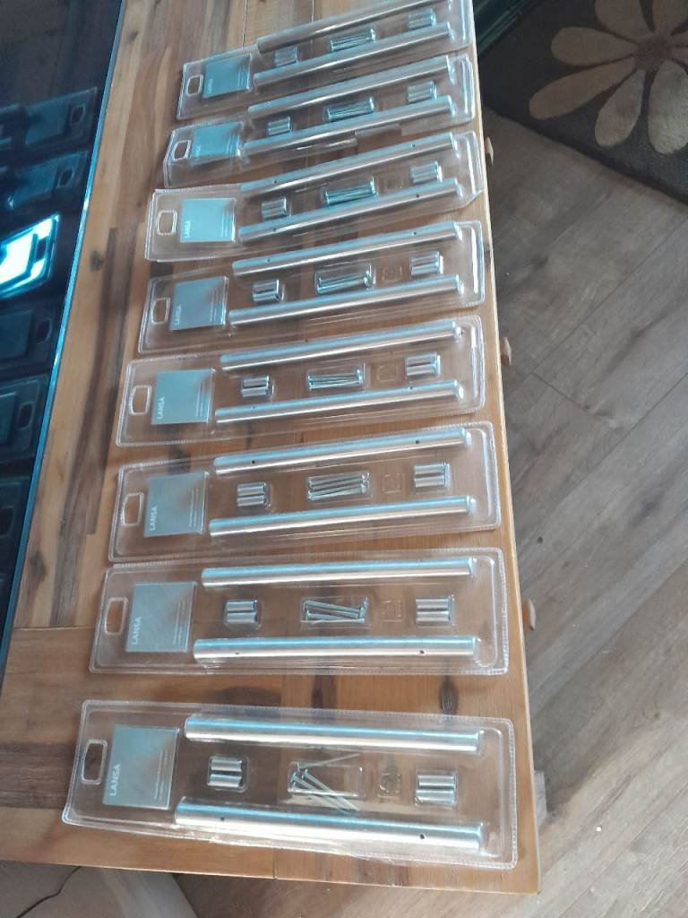 Stainless steel handles.Each handle is 240min length .good quality handles.They were bought for a new fitted kitchen but were never used.There are eight packs of two.The price is for all eight packs