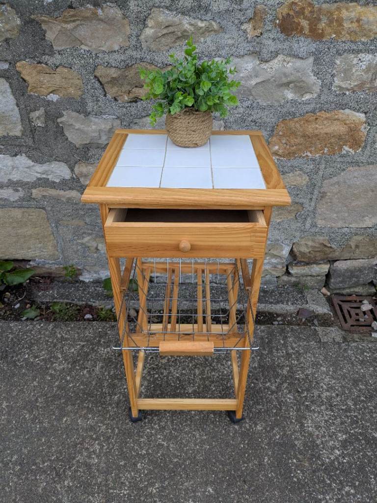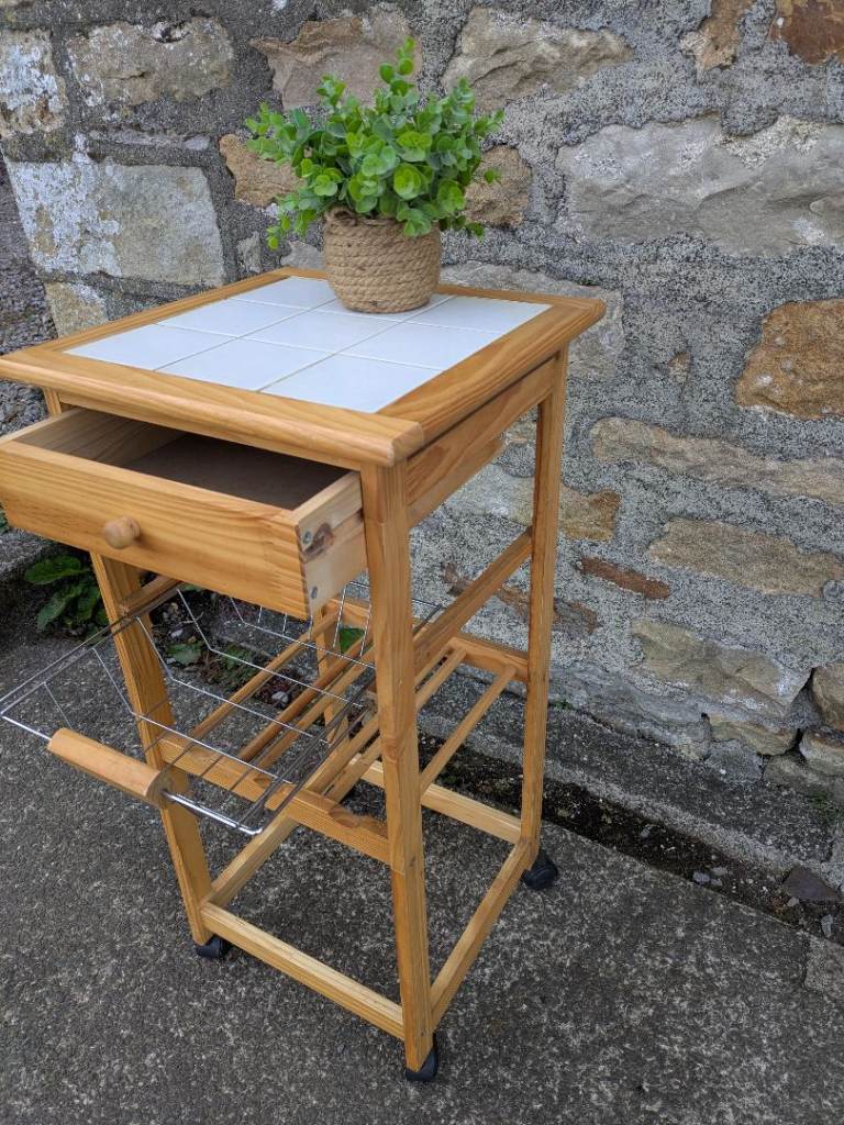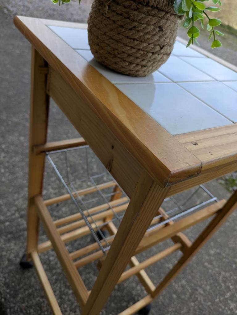 White tile top kitchen trolley. It has some marks but overall a nice item.
