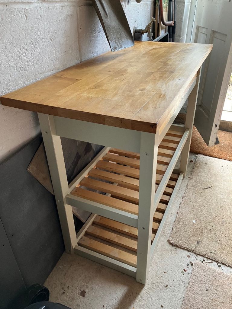 Wooden table with drawers. Well made unit with solid lats on two levels. Could add casters if needed. Can supply exact dimensions if required.