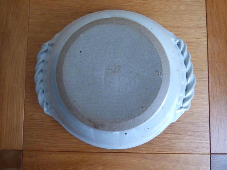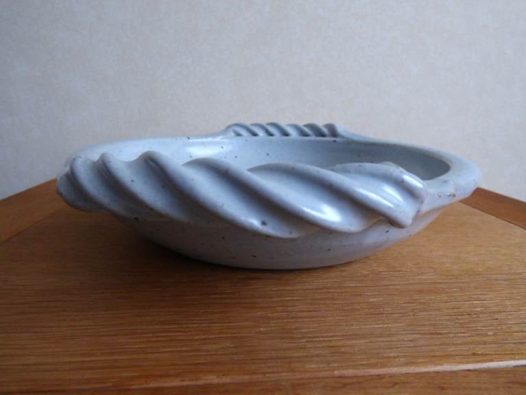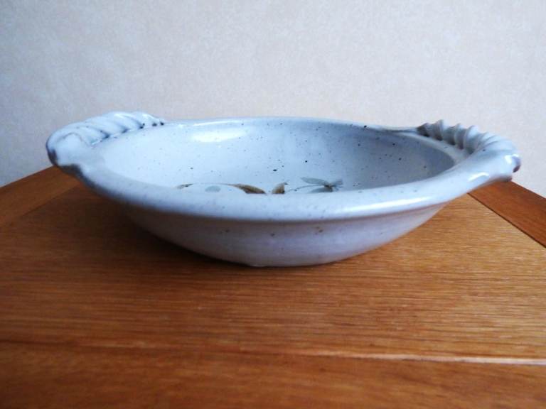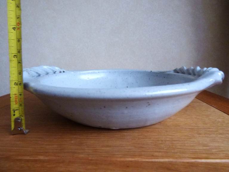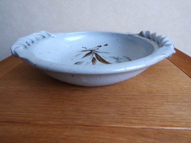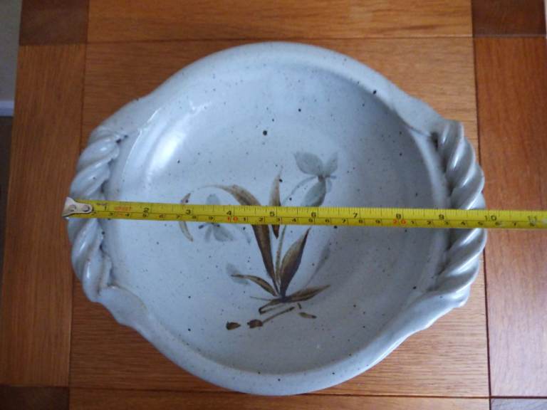Vintage 1980's Studio Art Pottery, Newcastle area local artist, 23 cm bowl / serving dish / fruit bowl with 2 twisted handles in immaculate gently used condition with no chips, crazing or cracks. Bought direct from the potter when selling on Jesmond Dene Bridge mid 1980's, good handles to hold and carry.