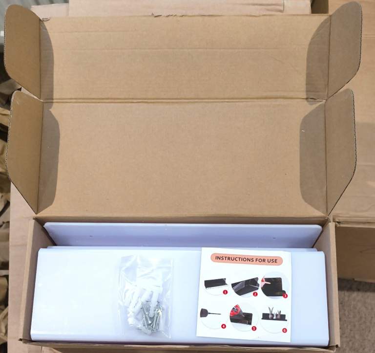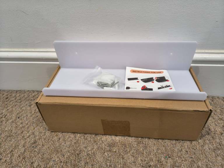 For sale is a set of 5 high-quality white floating wall shelves, still brand new in their original packaging.