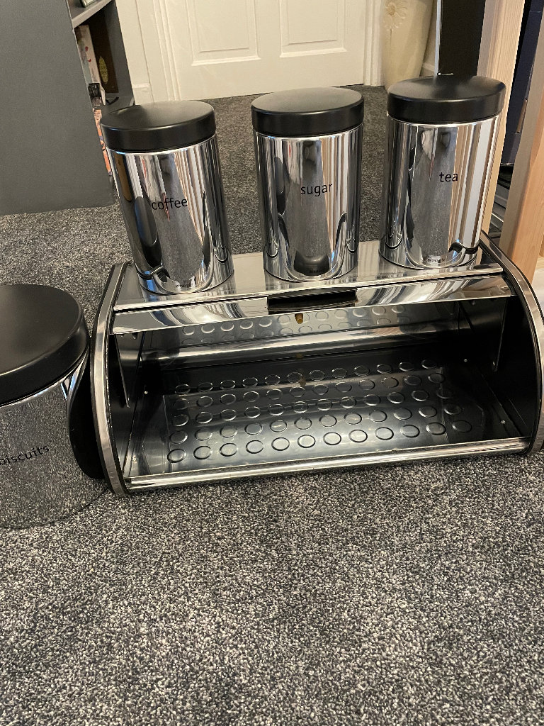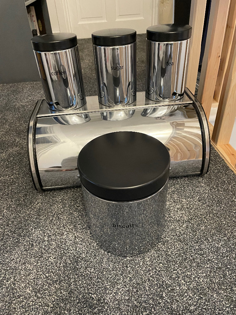 Bread bin, biscuit tin & tea coffee & sugar canisters